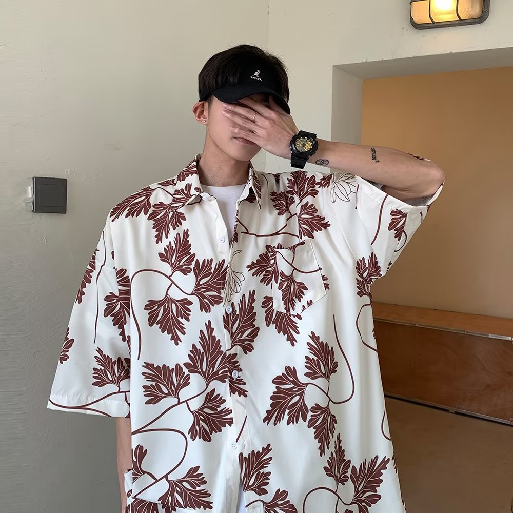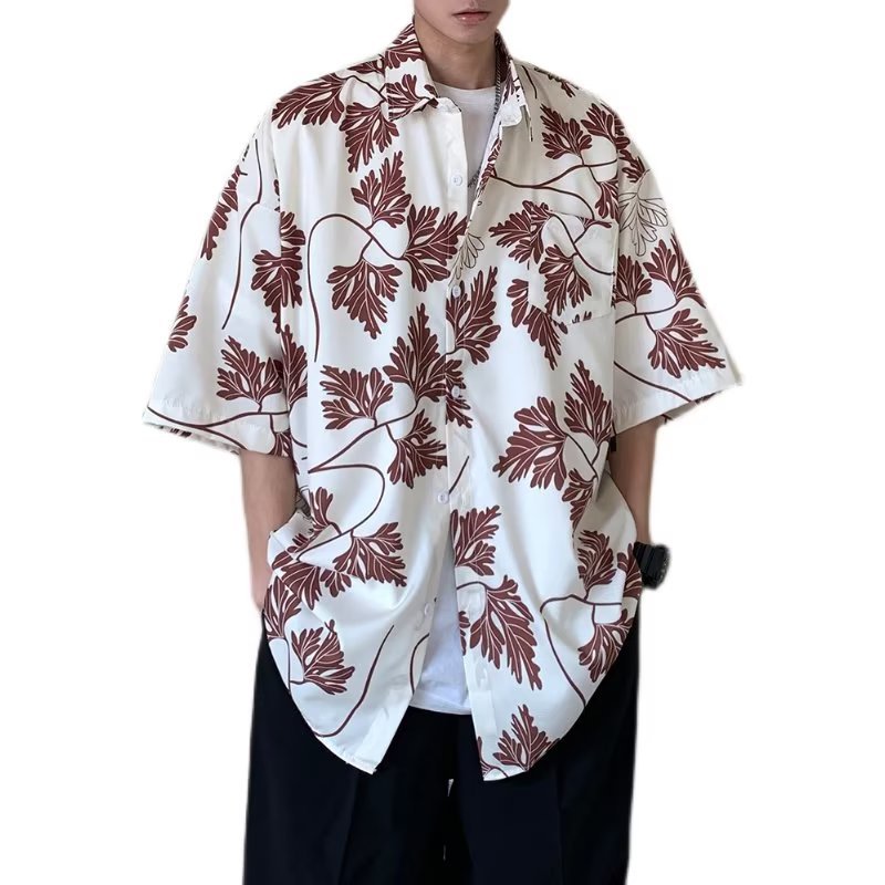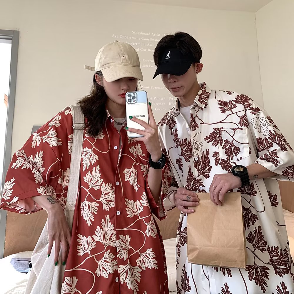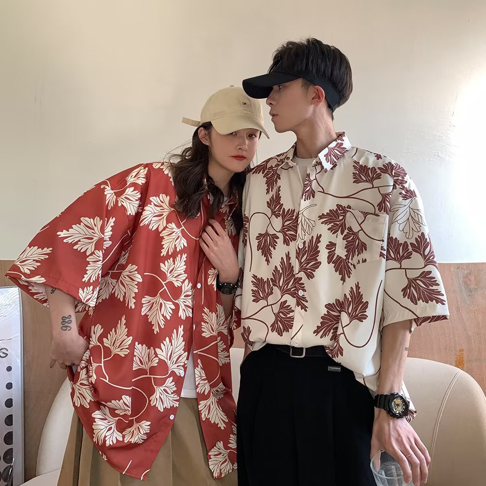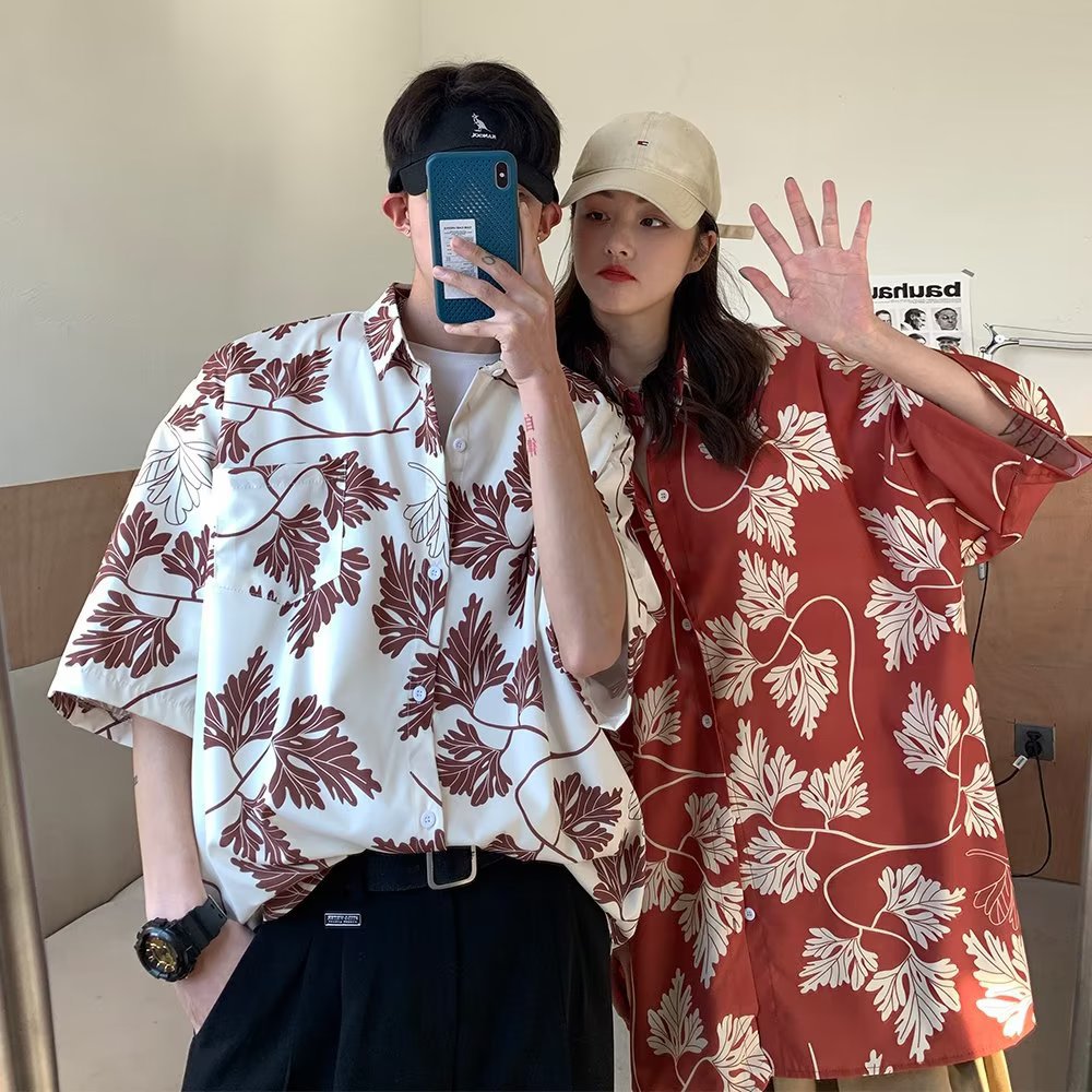 夏季短袖碎花衬衫男女夏威夷复古港风设计感宽松冰丝衬衣情侣装