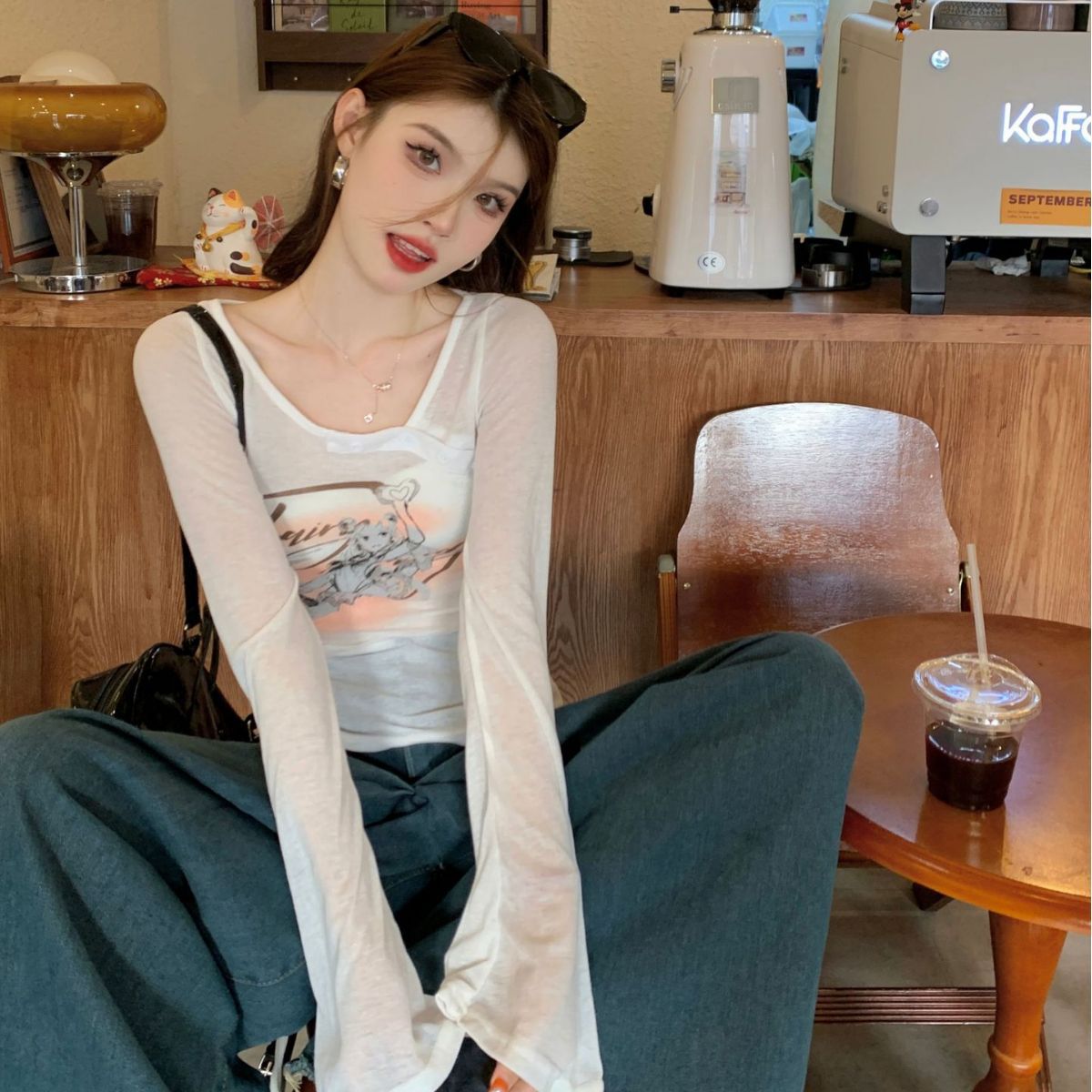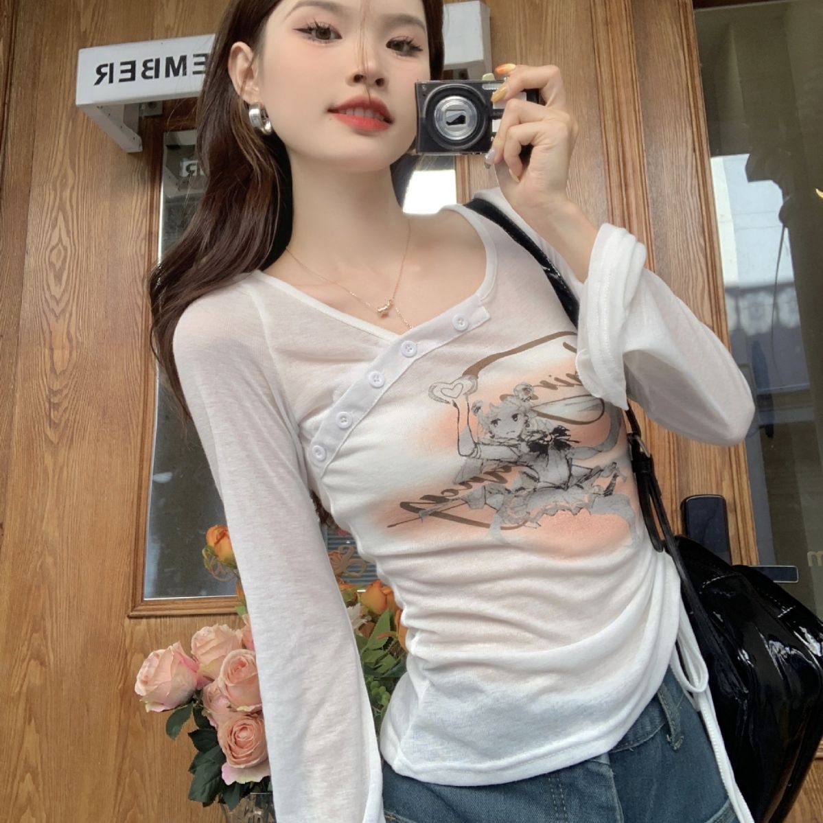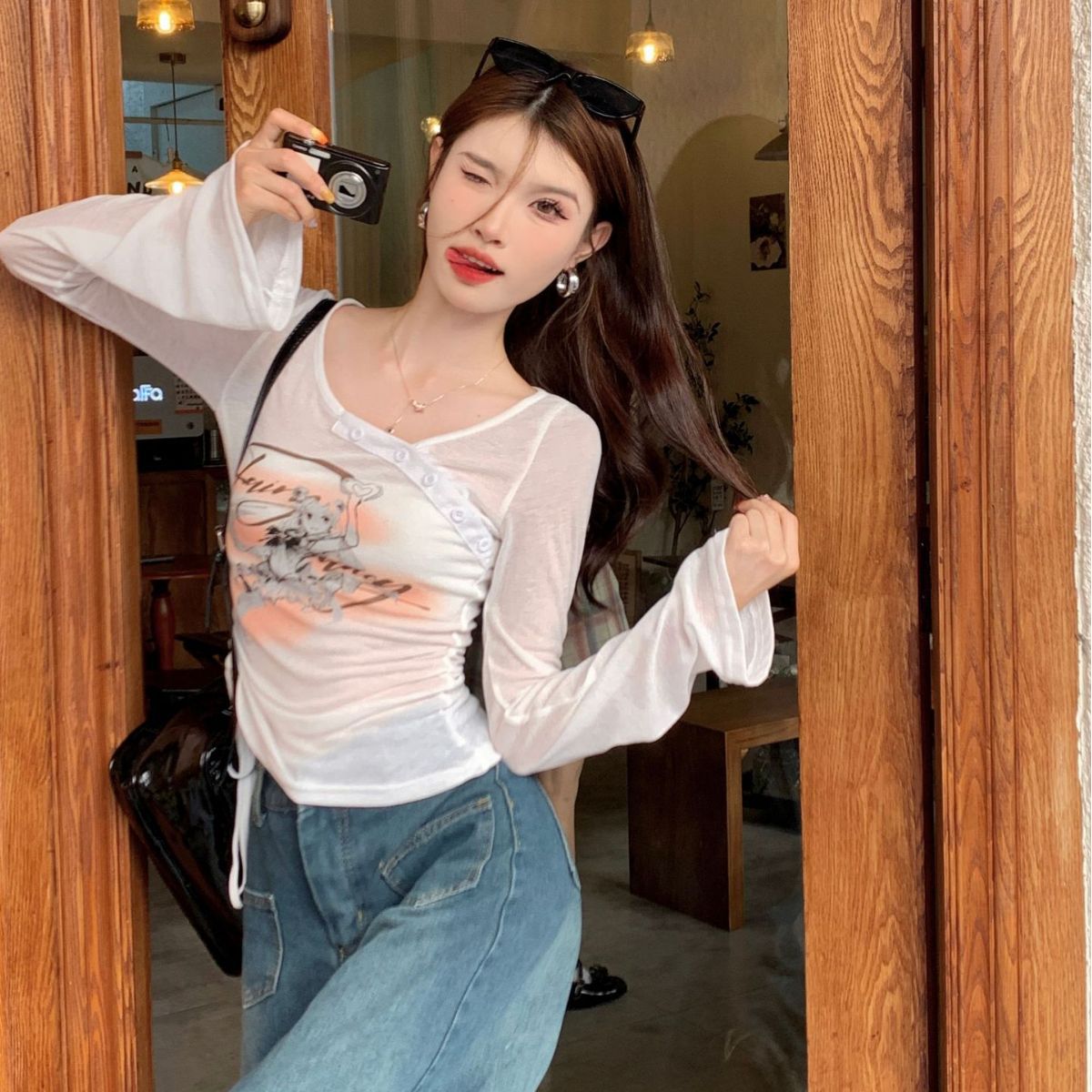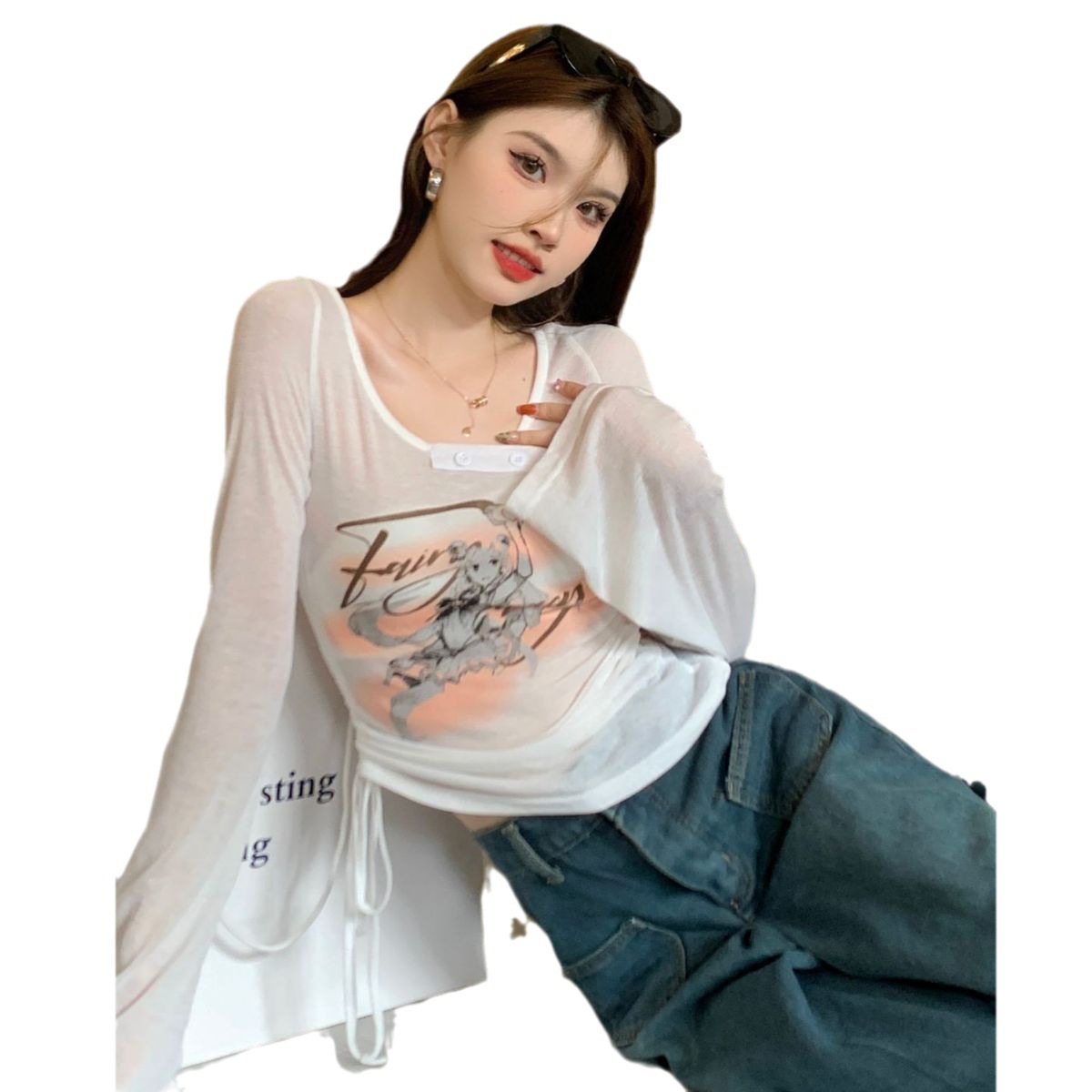 纯欲不规则长袖防晒长袖T恤女夏季新款修身显瘦抽绳短款上衣