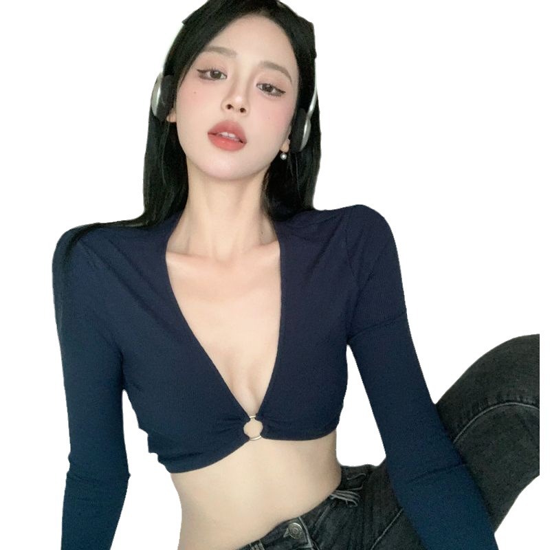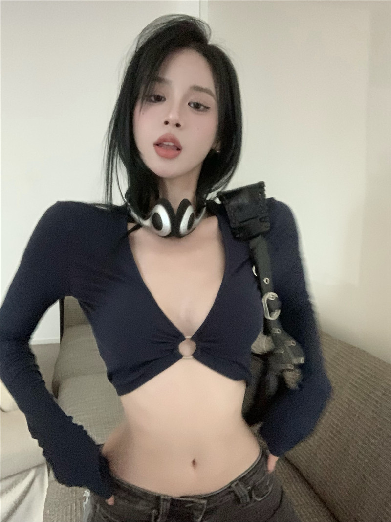 螺纹辣妹黑色长袖T恤女夏季紧身性感别致短款露脐内搭打底上衣女