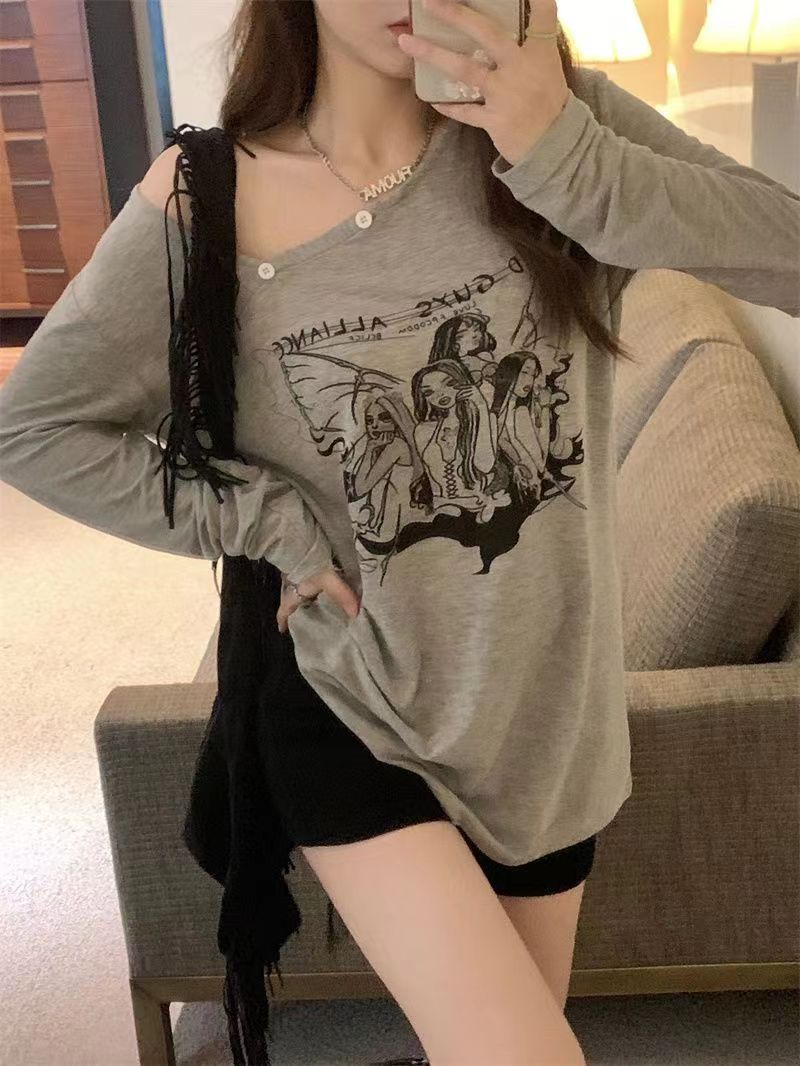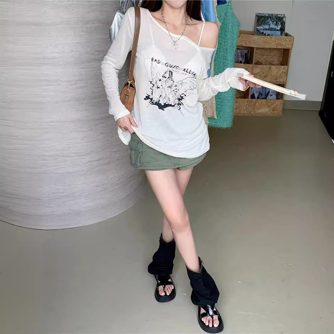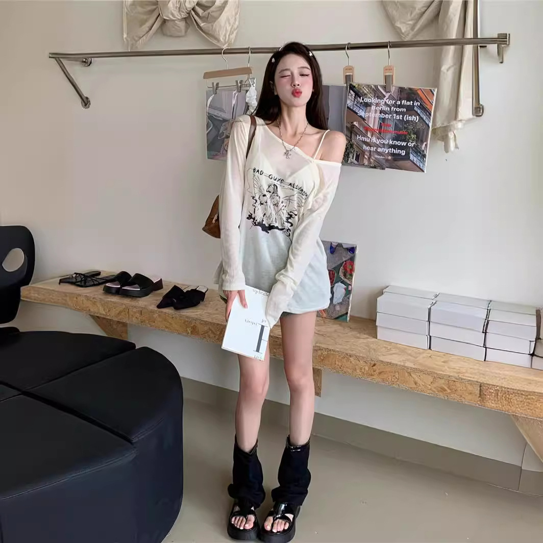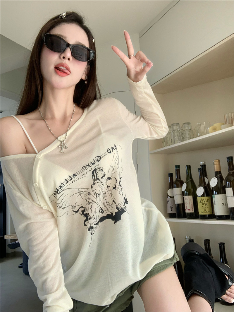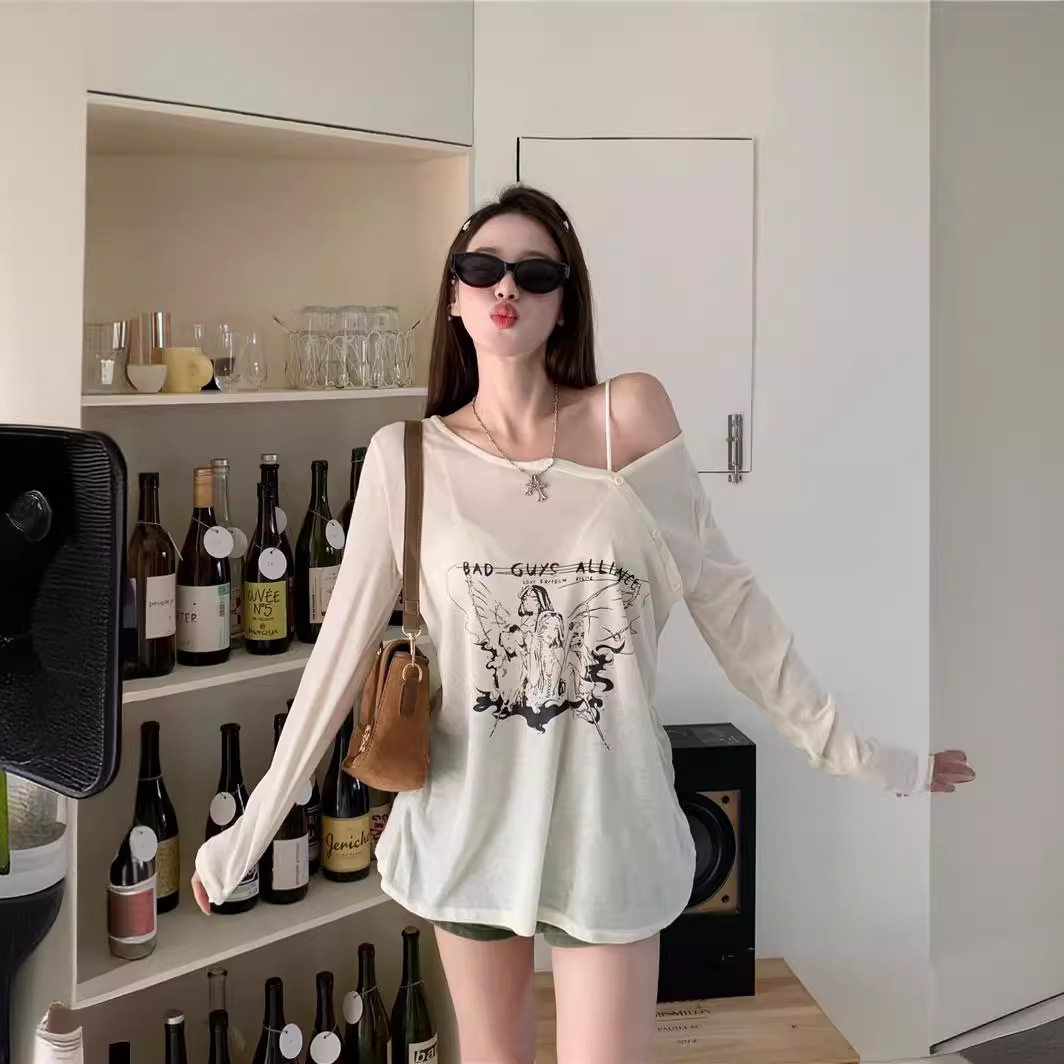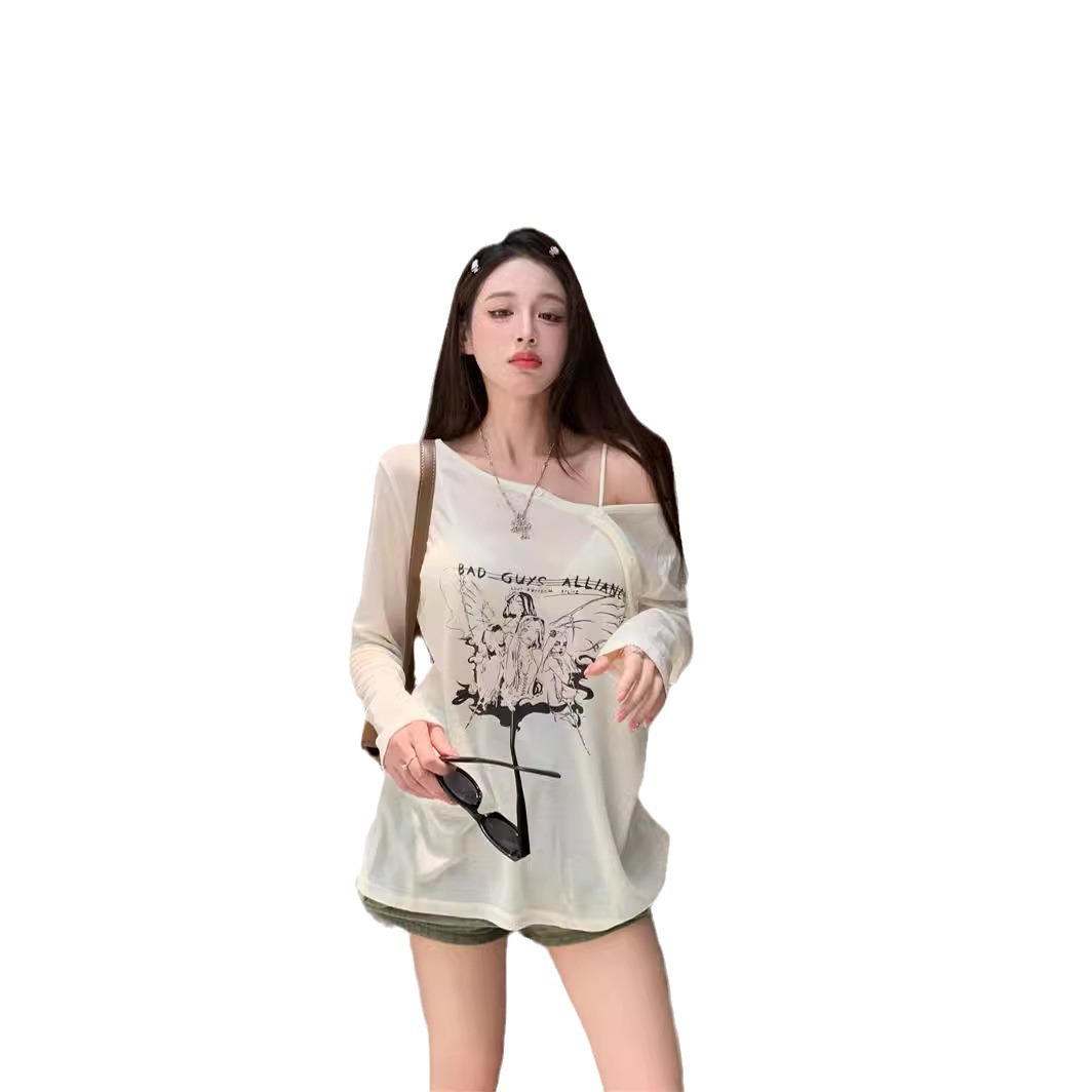 螺纹冰丝露肩斜肩宽松圆领薄防晒衫长袖T恤女夏季透气甜辣风罩衫