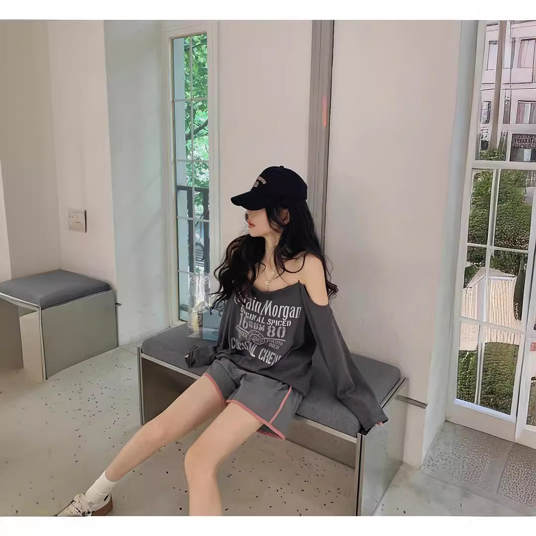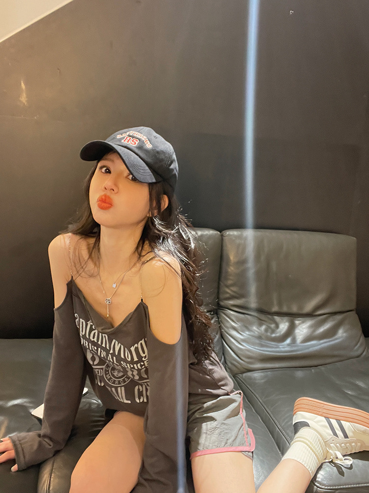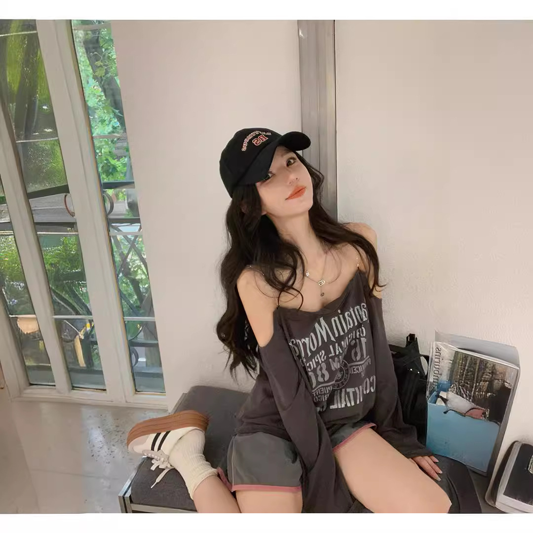 露肩吊带链接长袖t恤女年新款性感纯欲辣妹上衣显瘦欧美风潮