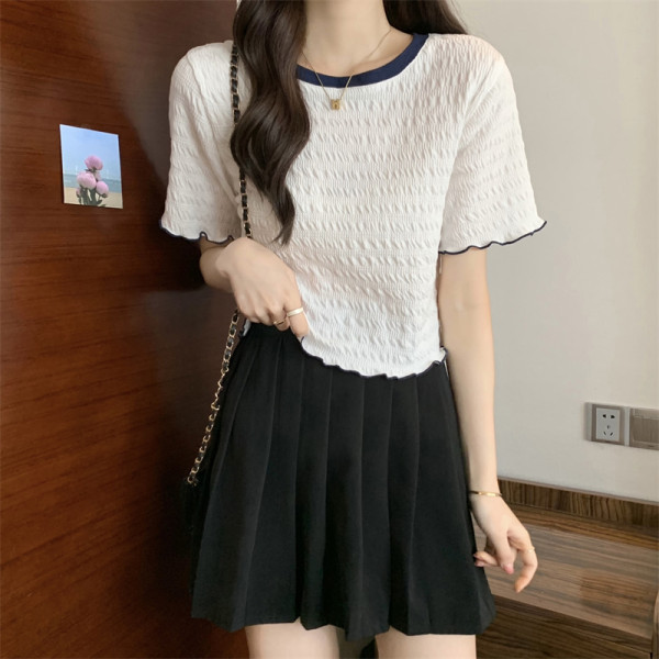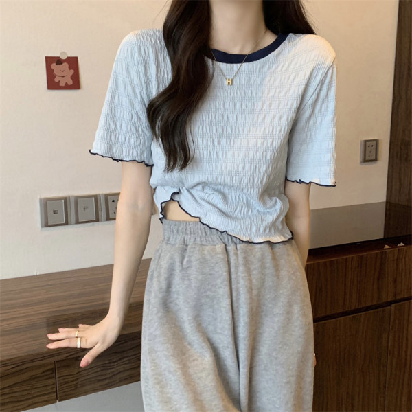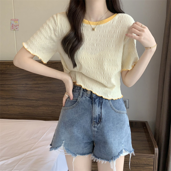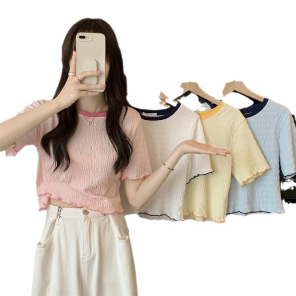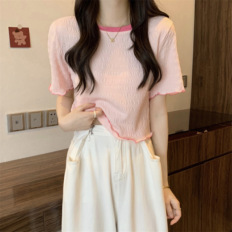 夏季木耳边正肩短袖粉色T恤女设计感小众纯欲风短款中袖上衣T恤