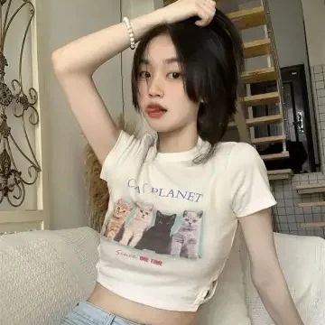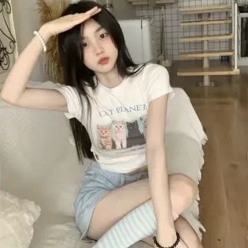 辣妹白色短袖镂空猫咪T恤女夏季修身短款纯欲风甜辣紧身正肩上衣
