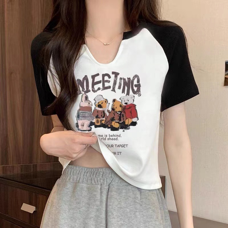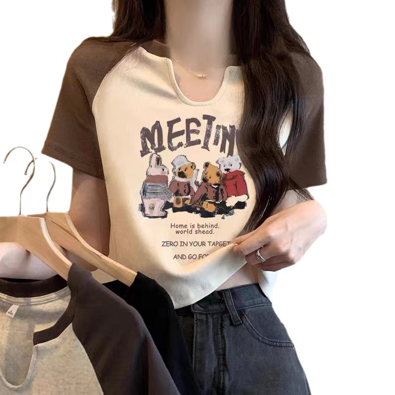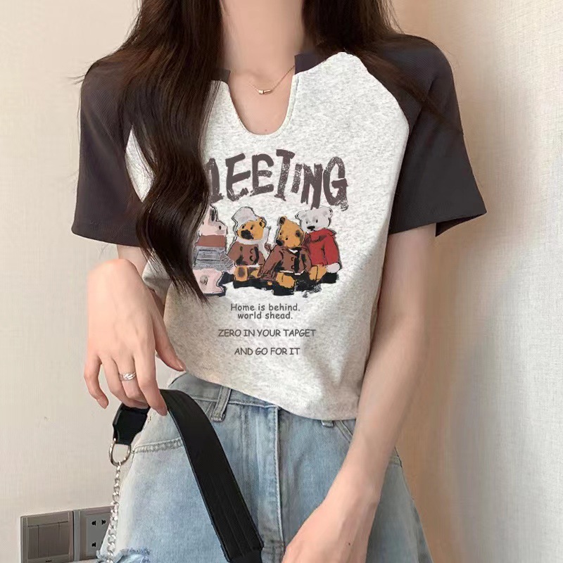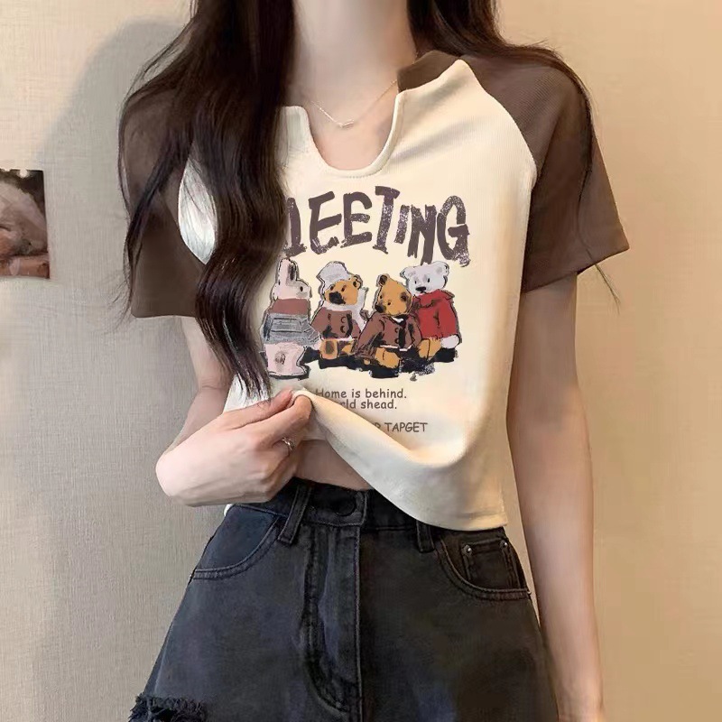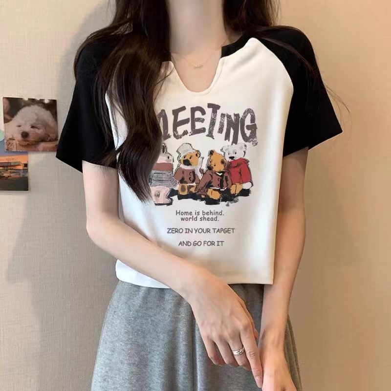 螺纹美式复古小熊短袖t恤潮2025夏季新款韩版设计感小V领打底上衣