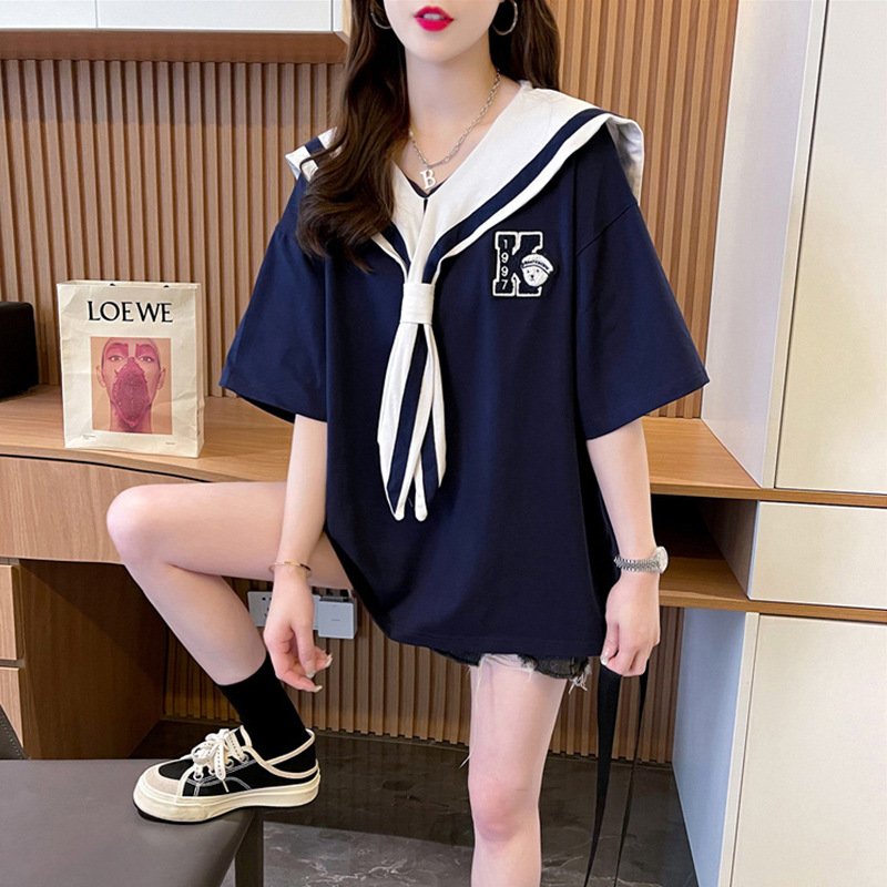 大码女装海军领刺绣短袖T恤女夏季新款韩版宽松百搭设计感上衣潮