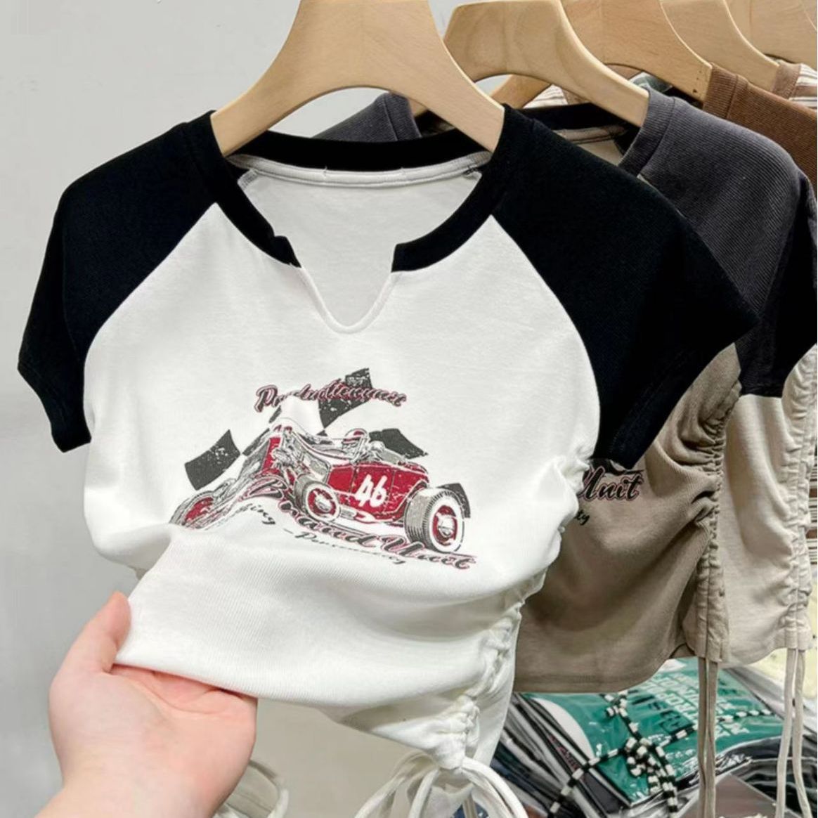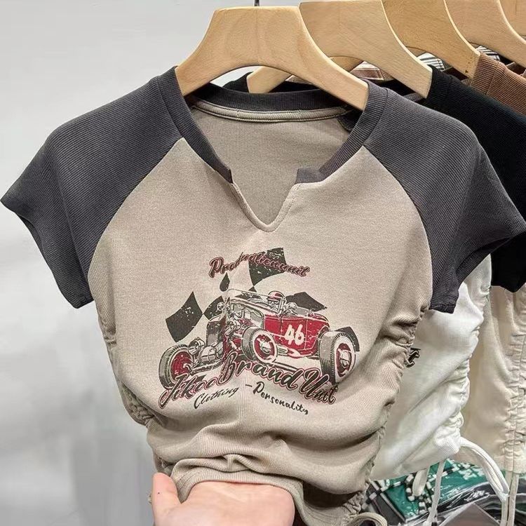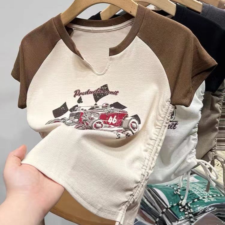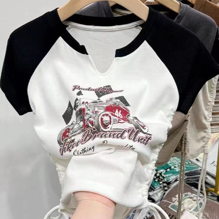 螺纹夏装新款bm风美式复古辣妹短款显瘦抽绳印花V领短袖T恤女