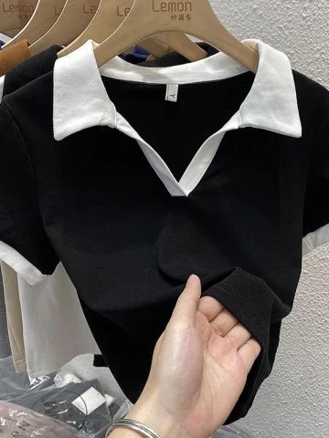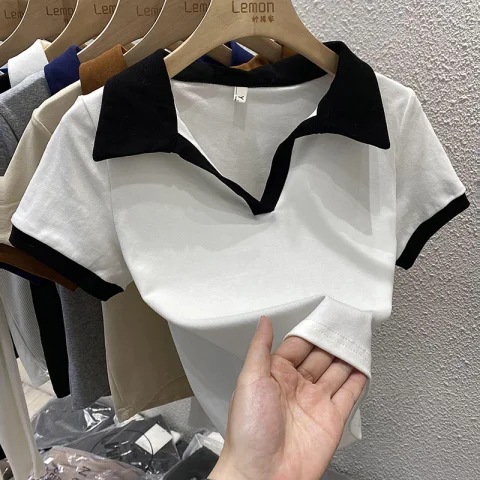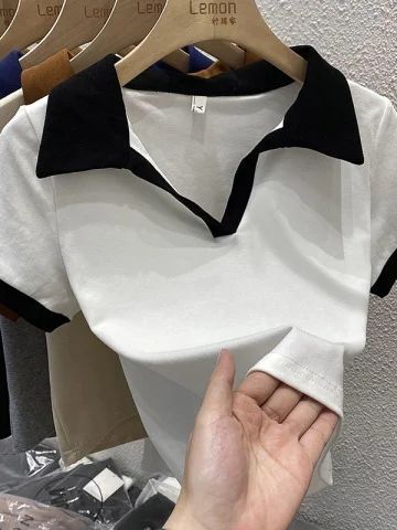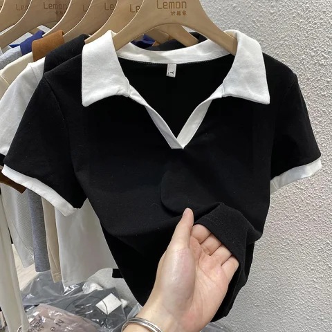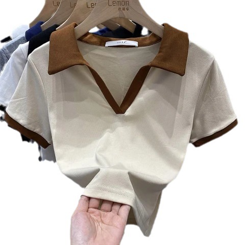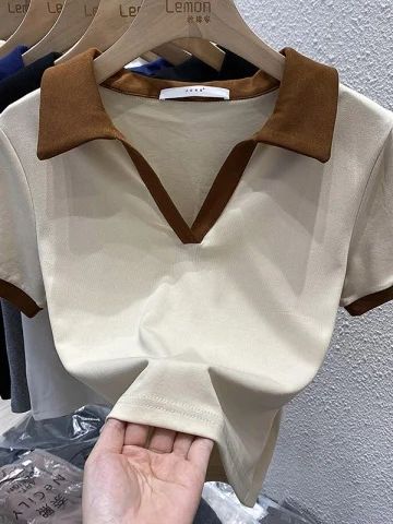 新款法式甜美风polo短袖女V领t恤夏季新款修身高腰显瘦上衣潮