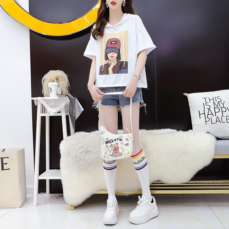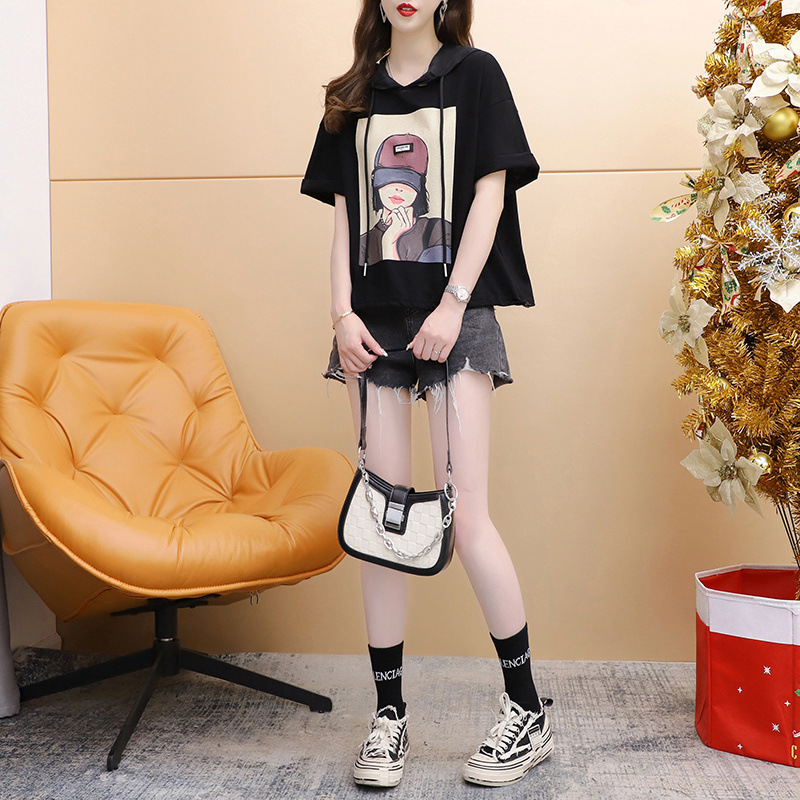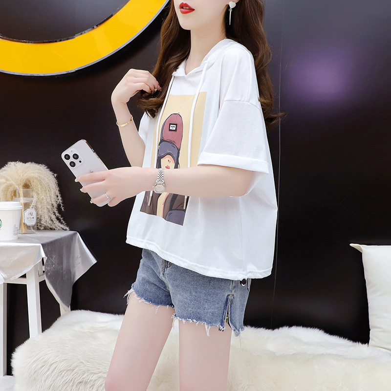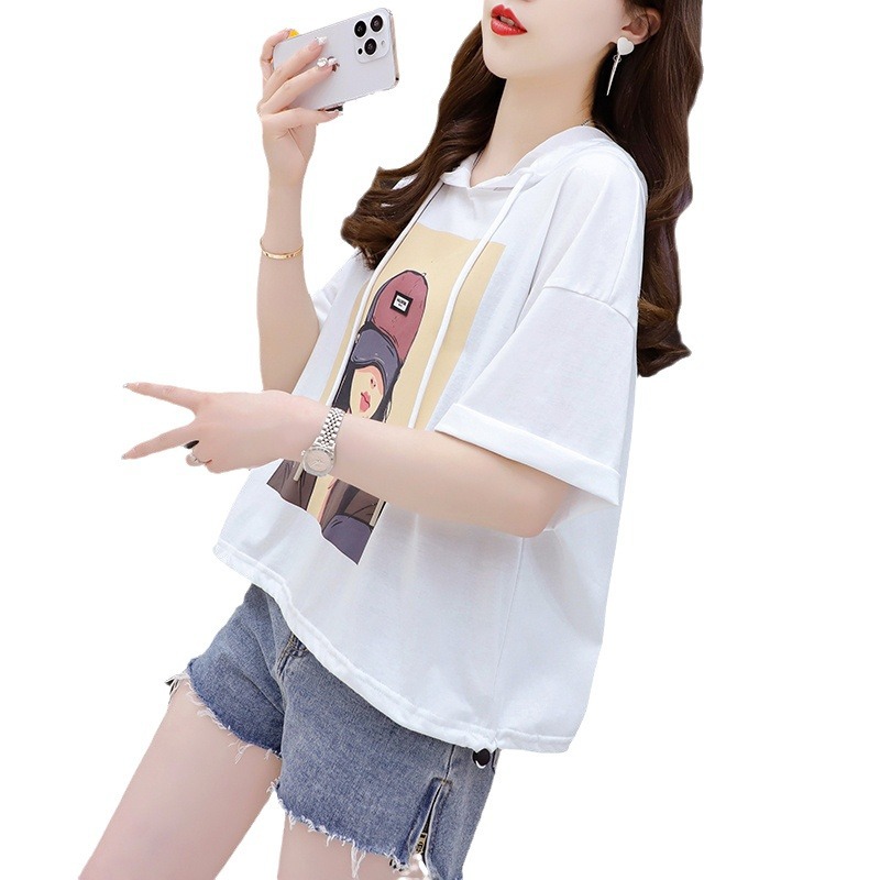 纯棉短袖体t恤女夏季新款宽松连帽网红炸街百搭短款小个子上衣潮