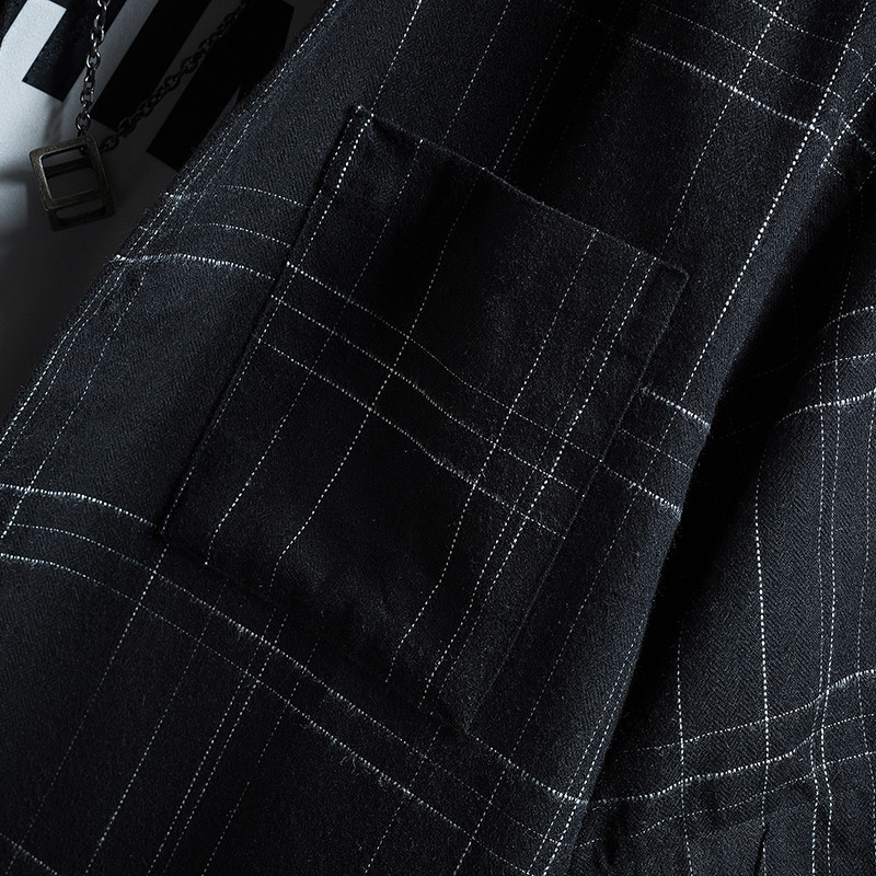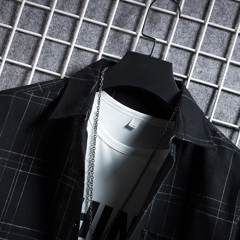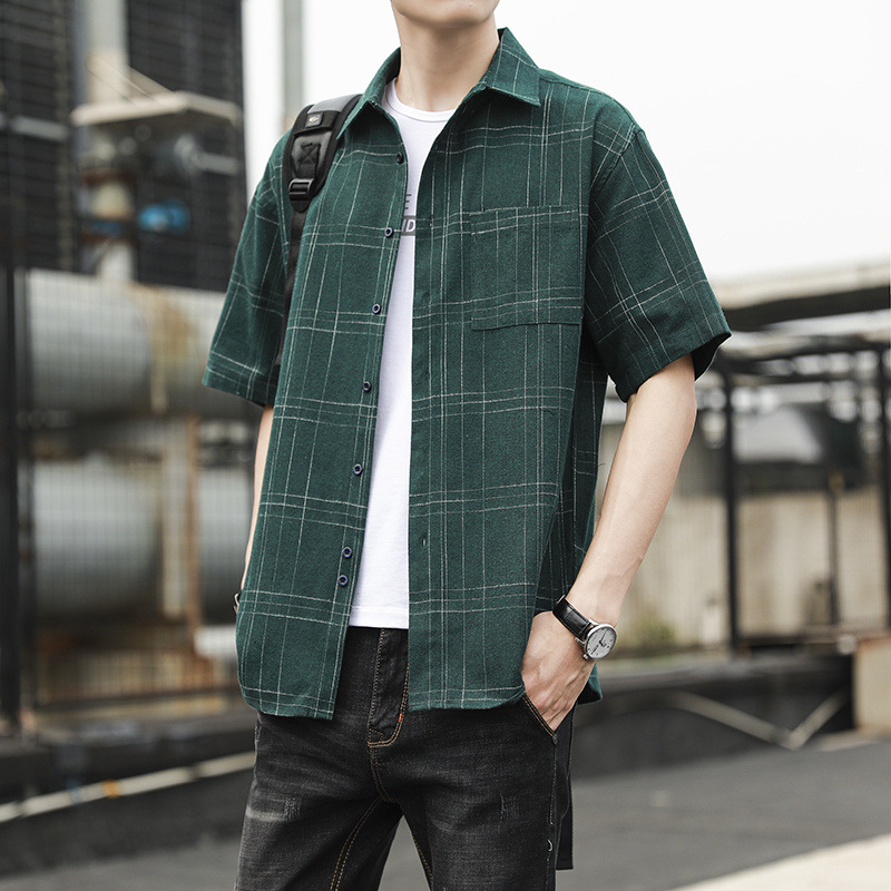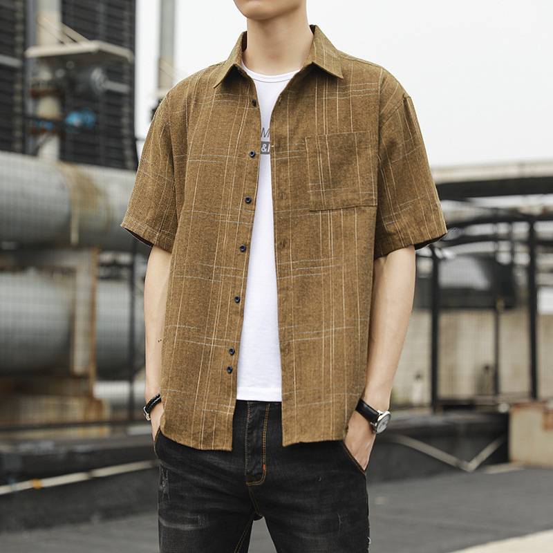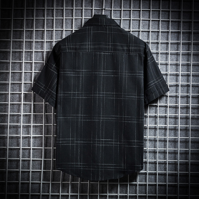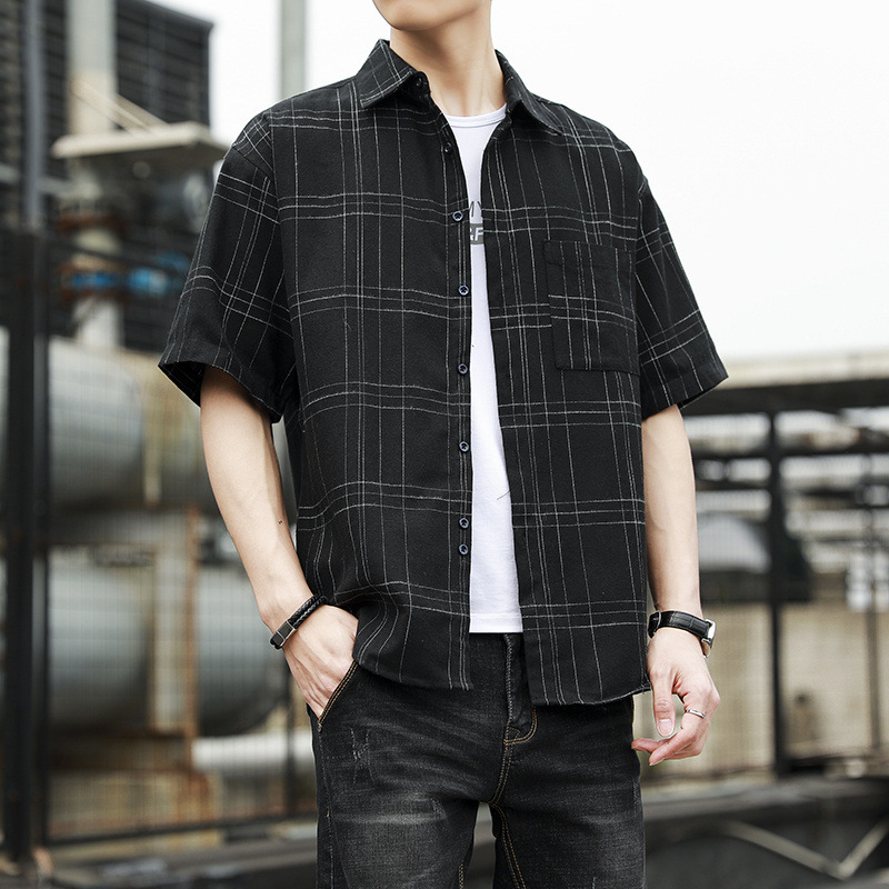 男士夏季新款中袖短袖衬衫时尚简约格子竖条纹开衫翻领潮上衣