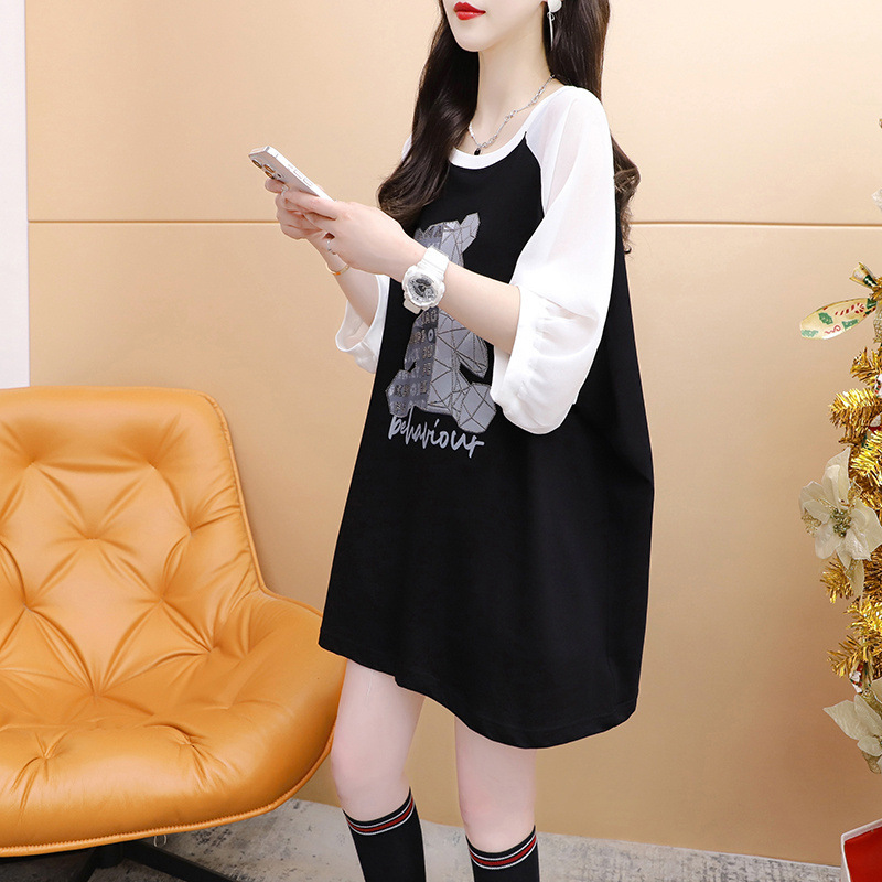 夏季正肩圆领纯棉短袖T恤女卡通印花美式高街潮流中长款上衣