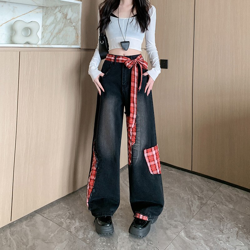 实拍实价~黑色拼接蝴蝶结阔腿裤牛仔裤女新款高腰宽松直筒裤子