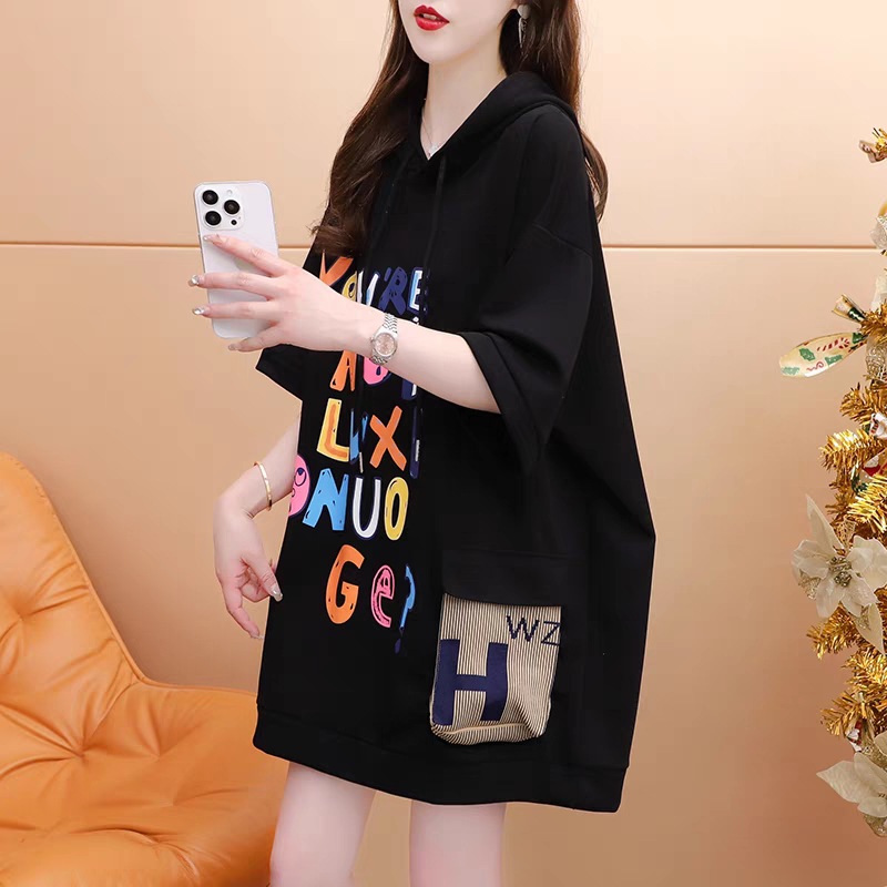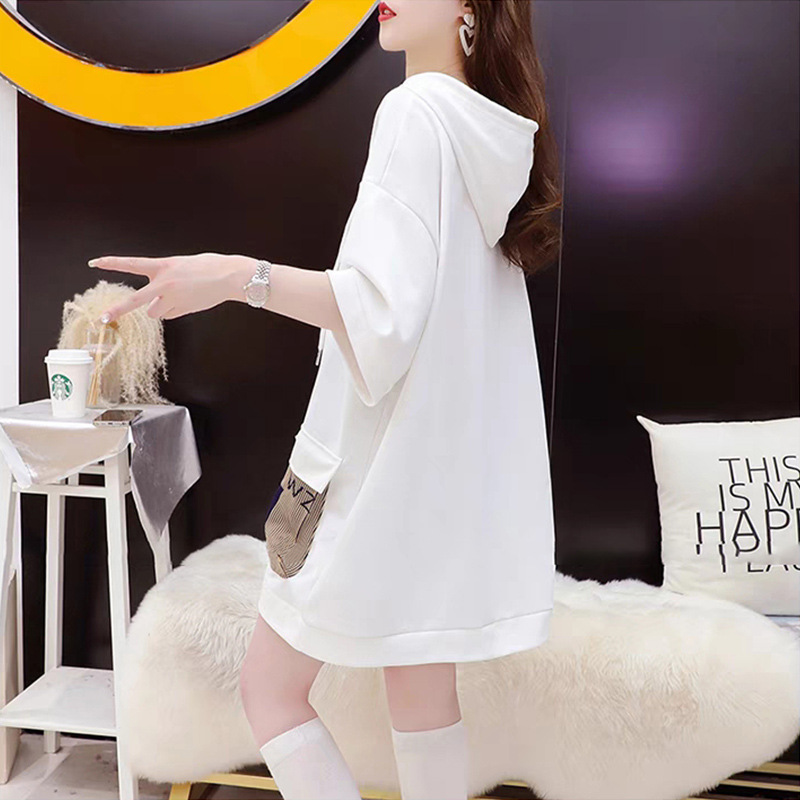 带口袋设计感连帽短袖T恤女中长款年新款夏季宽松慵懒风上衣