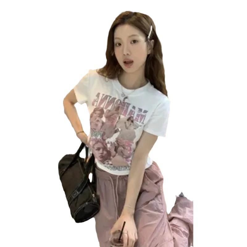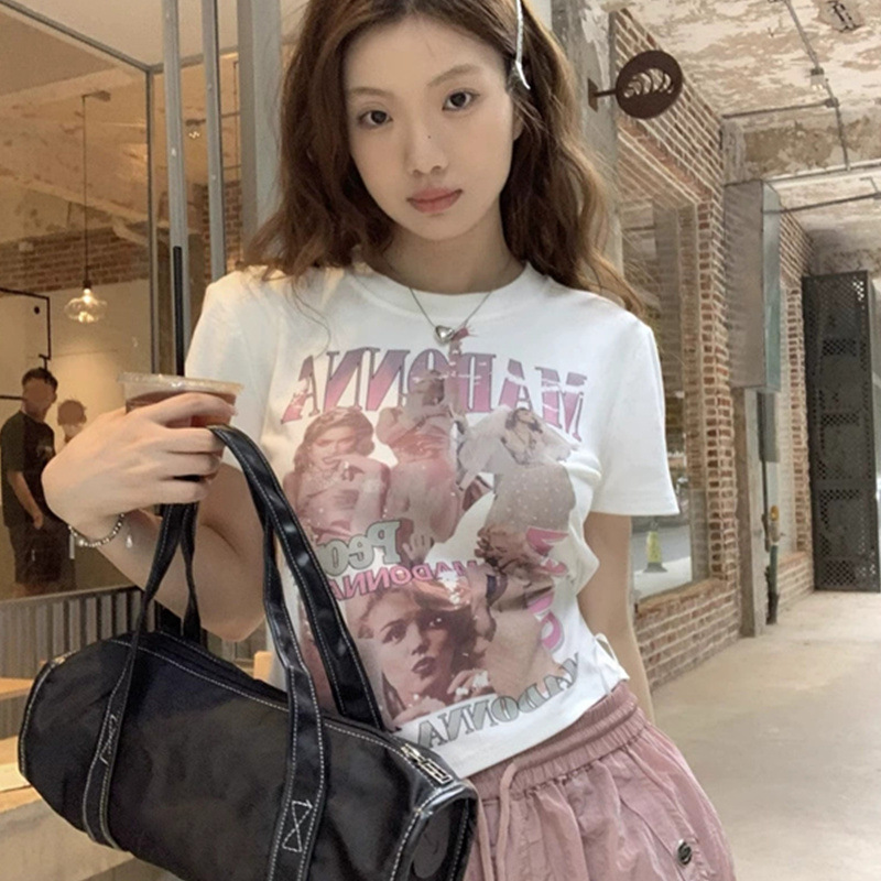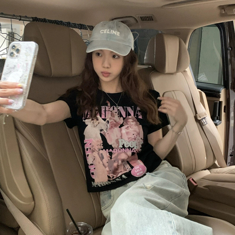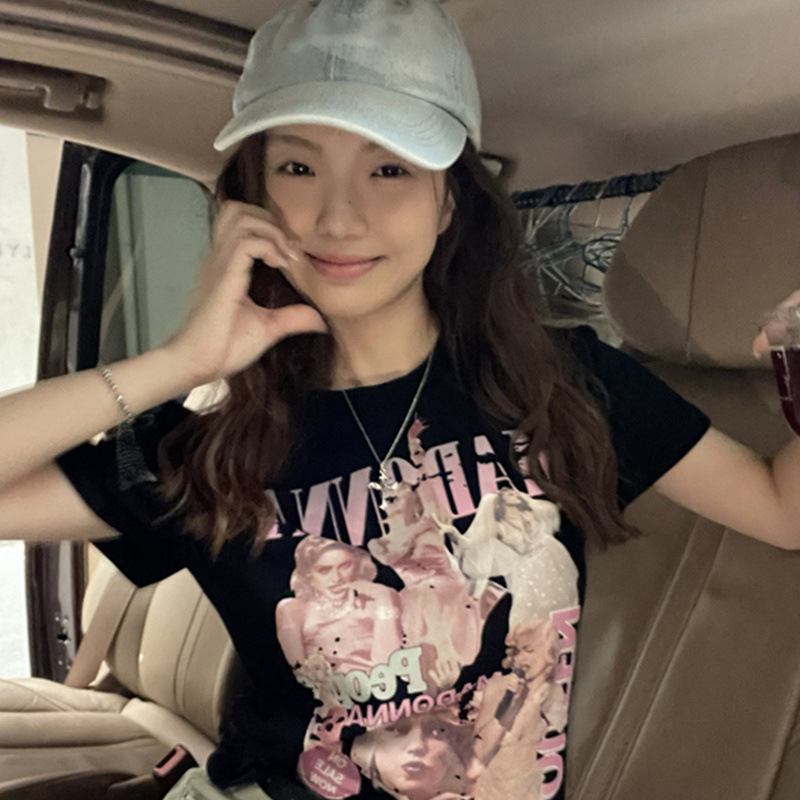 甜辣短袖T恤女夏季新款美式复古字母印花修身显瘦短款上衣ins