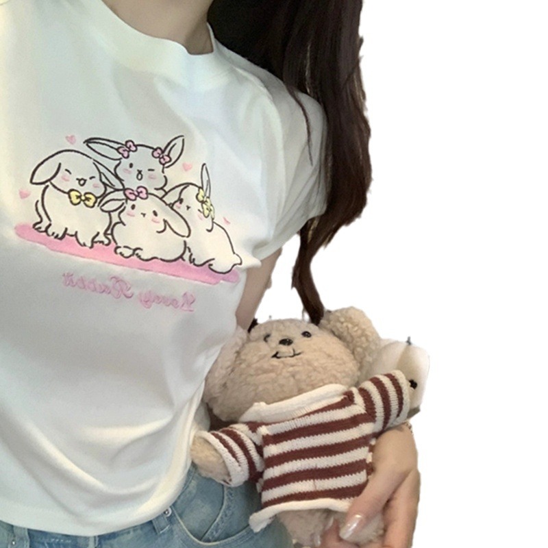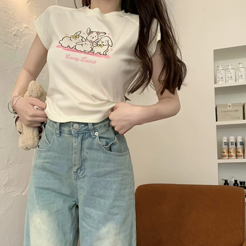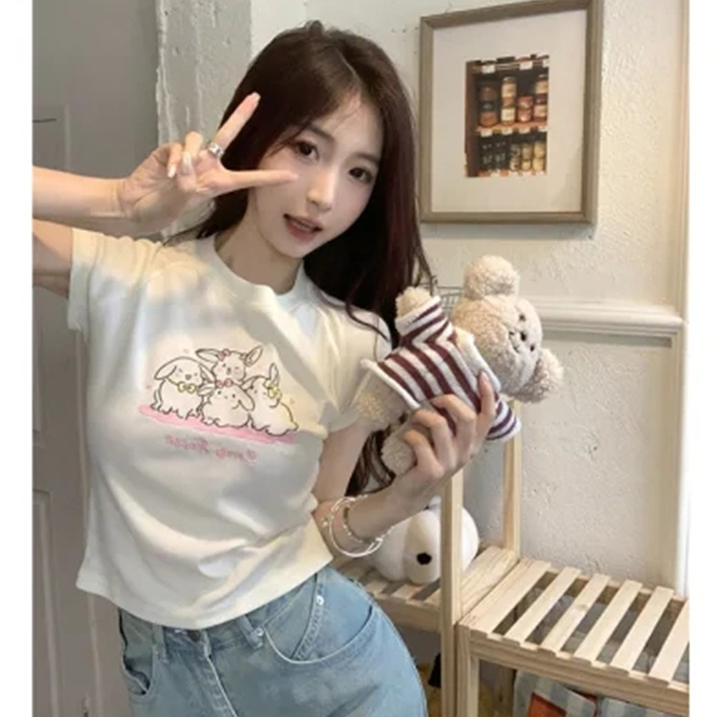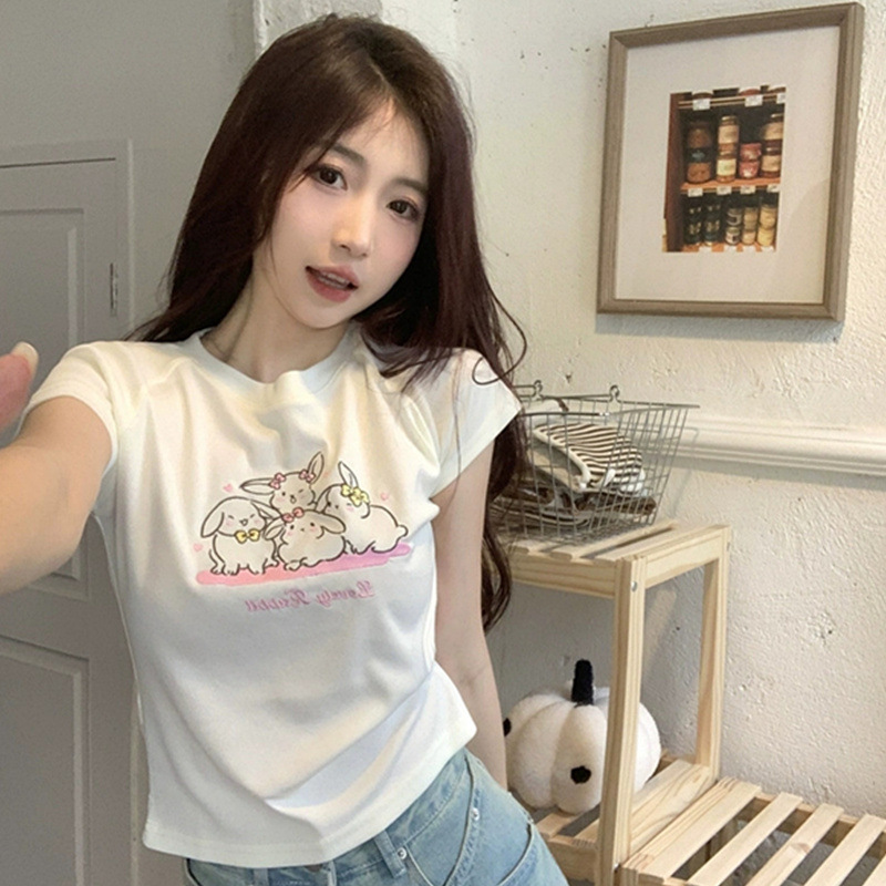 甜美正肩短袖T恤女夏季新款修身显瘦可爱兔子印花短款上衣ins