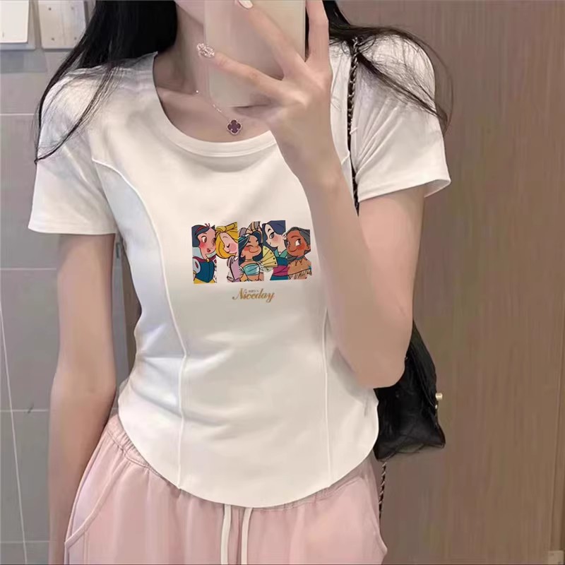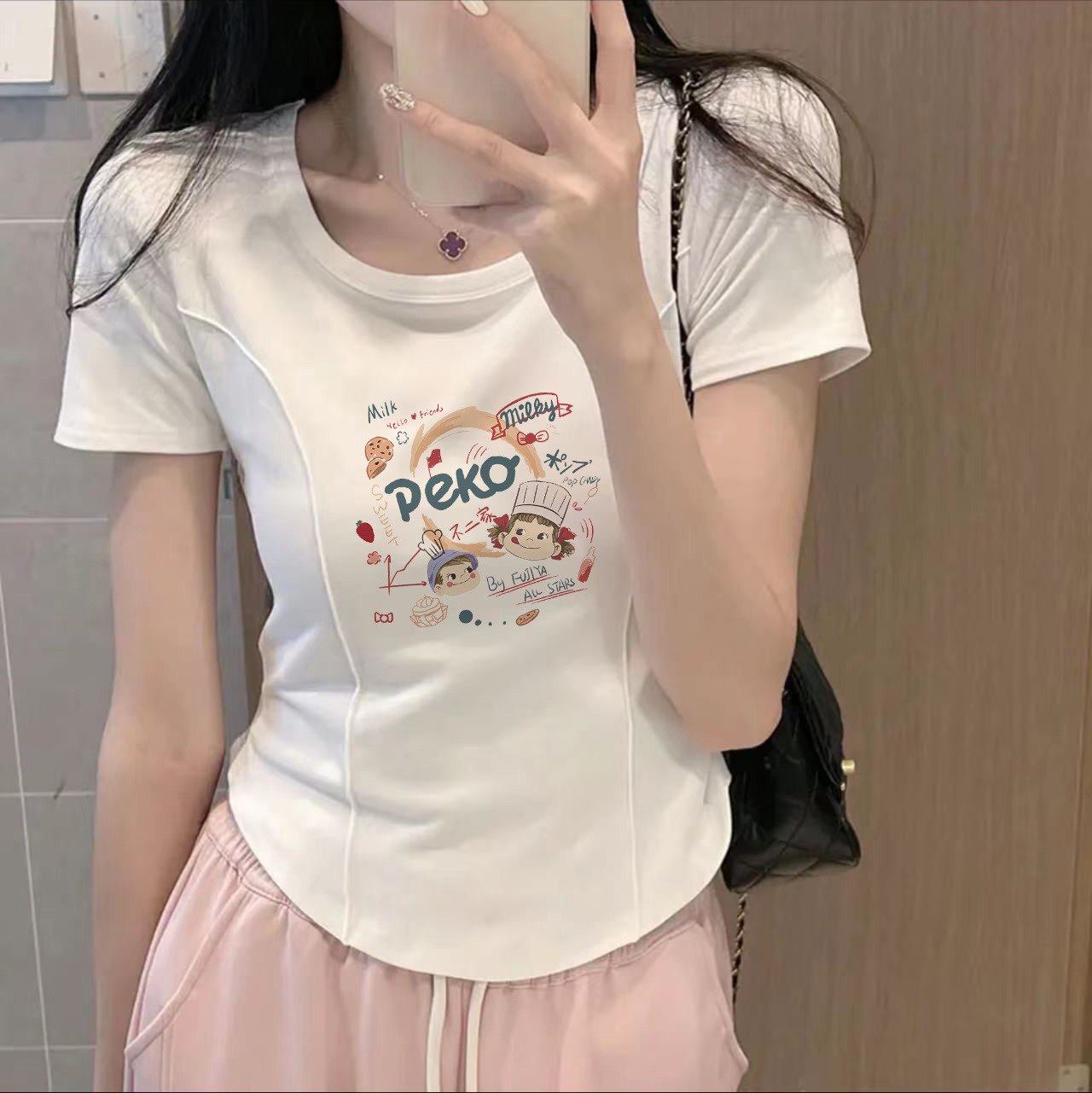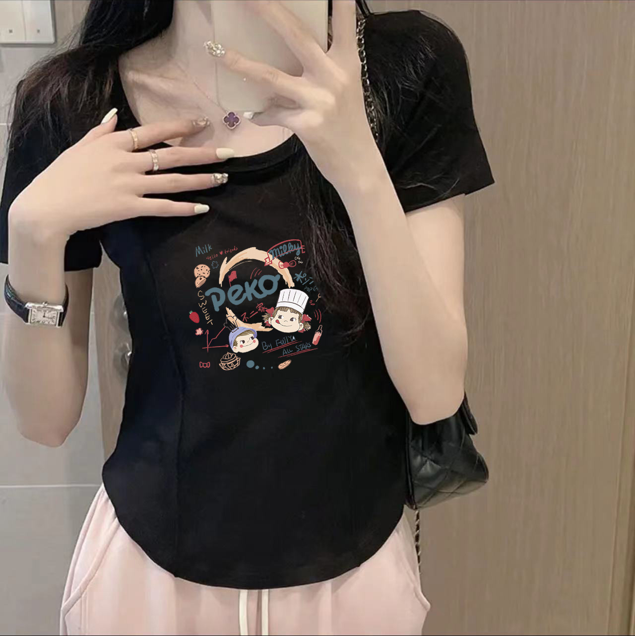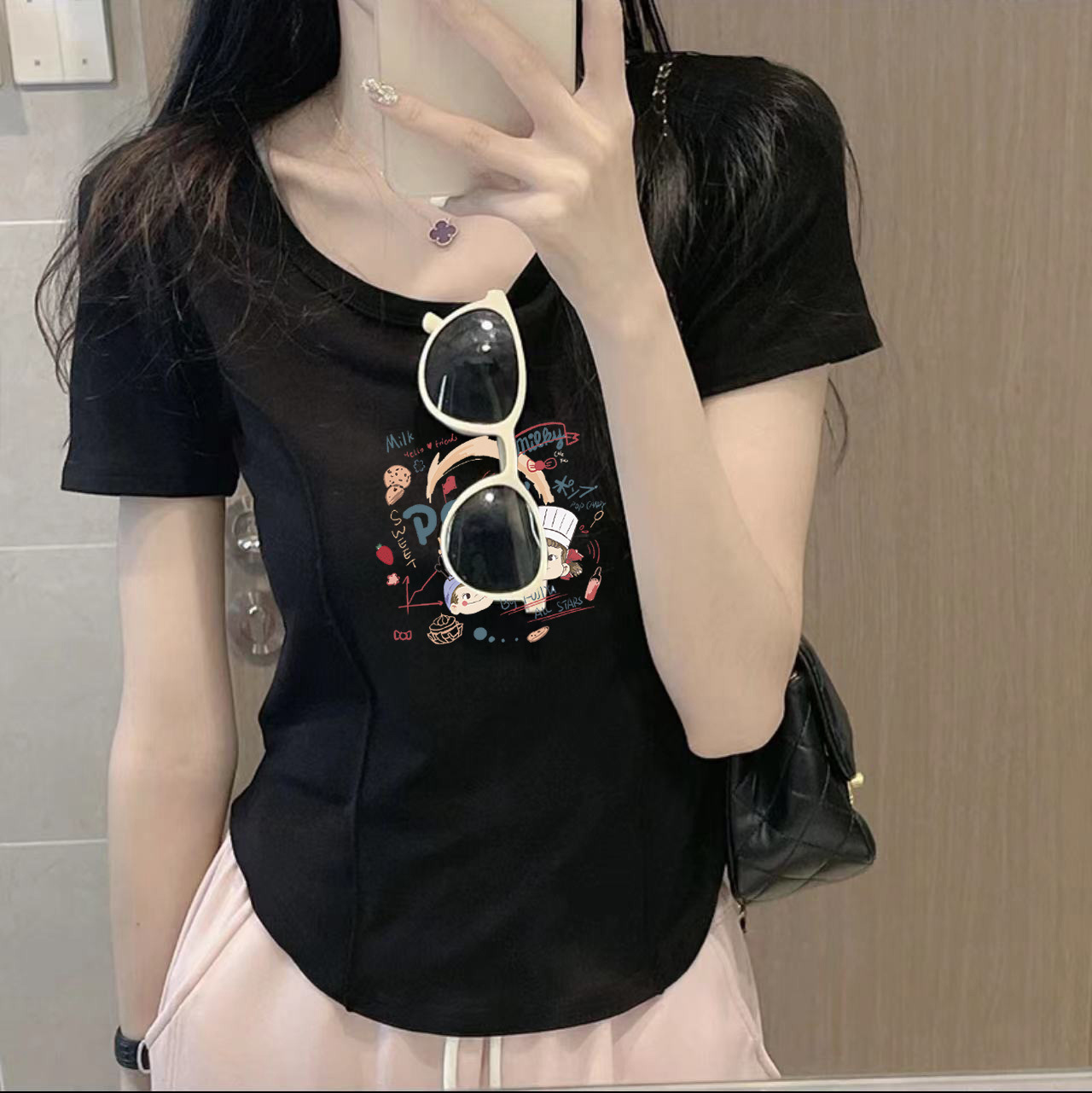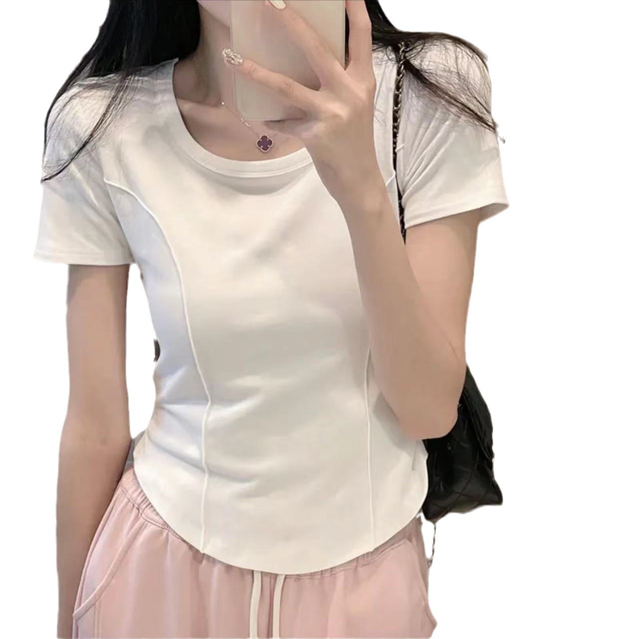 纯棉正肩紧身掐腰性感弧形下摆短袖t恤女夏季设计感小众显瘦上衣