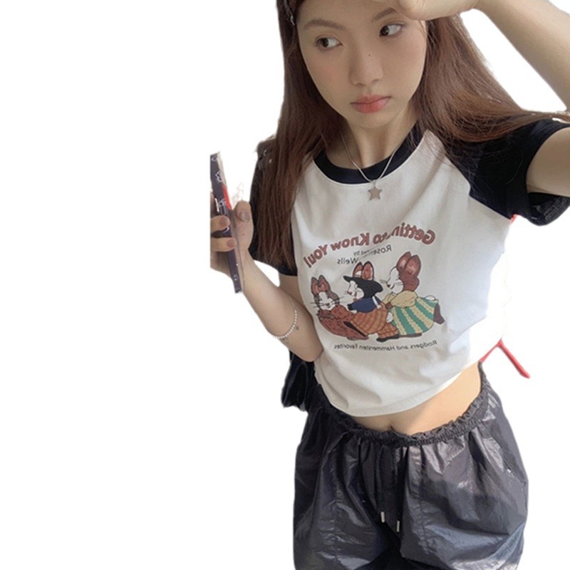 卡通印花插肩袖T恤女夏季新款内搭短款修身显瘦短袖港味chic上衣
