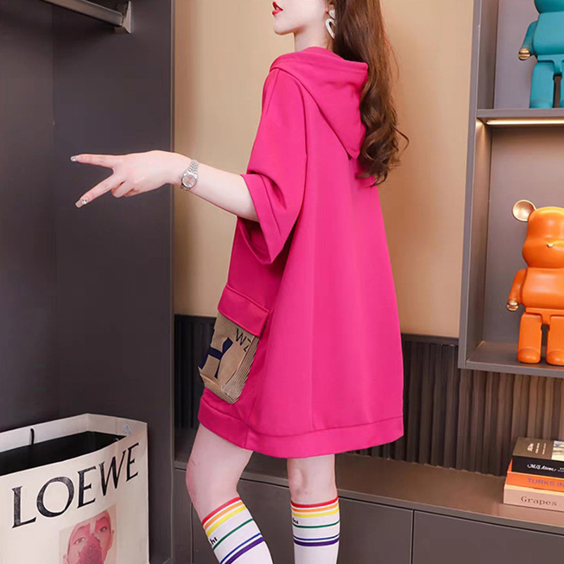 设计感连帽短袖T恤女中长款年新款夏季宽松慵懒风上衣