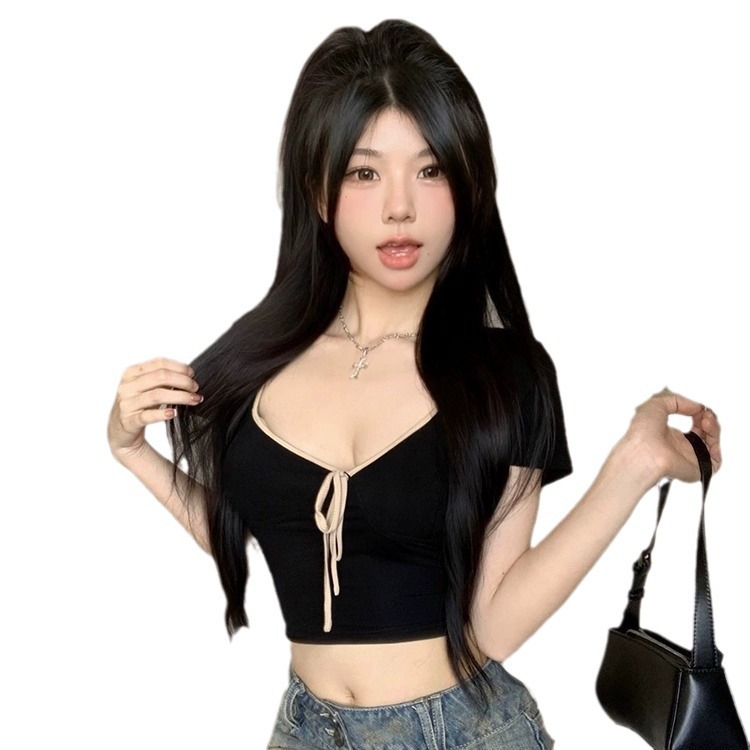 欧美气质绑带短袖针织衫女2025新款修身显瘦小个子夏季黑色短款