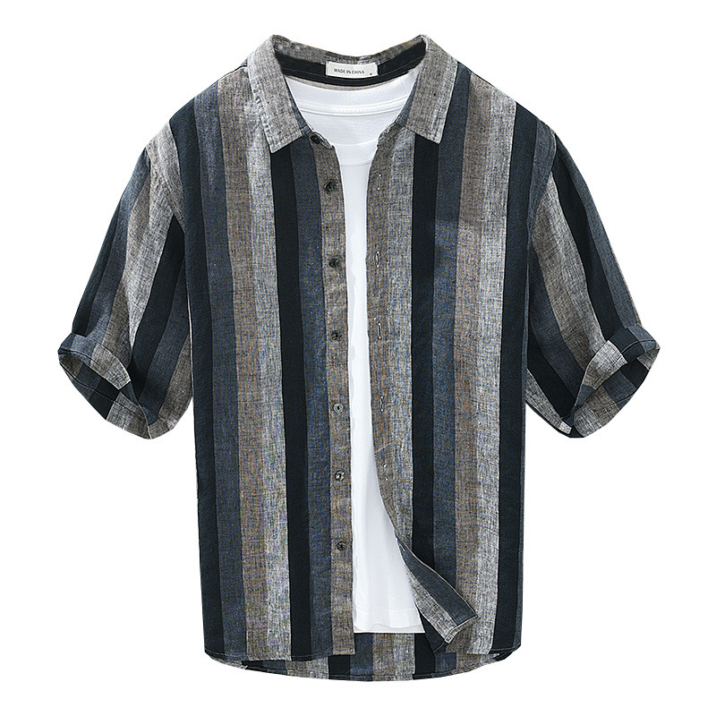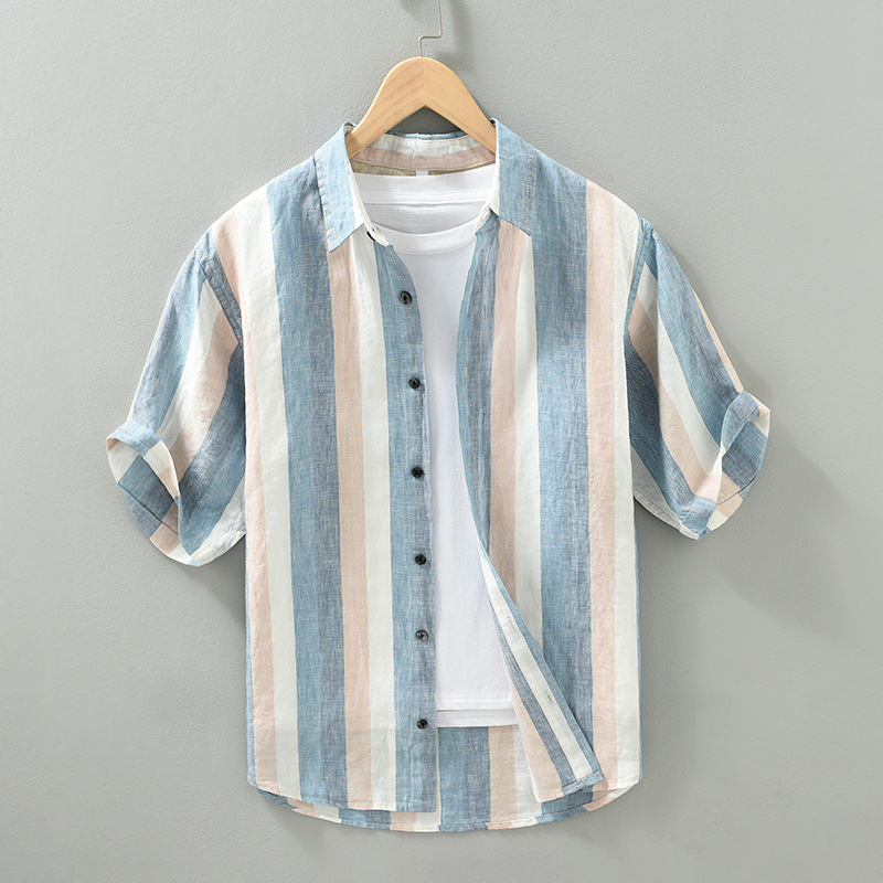 撞色竖条纹纯亚麻衬衫男夏季薄款日系复古设计感纯麻料贝壳扣衬衣
