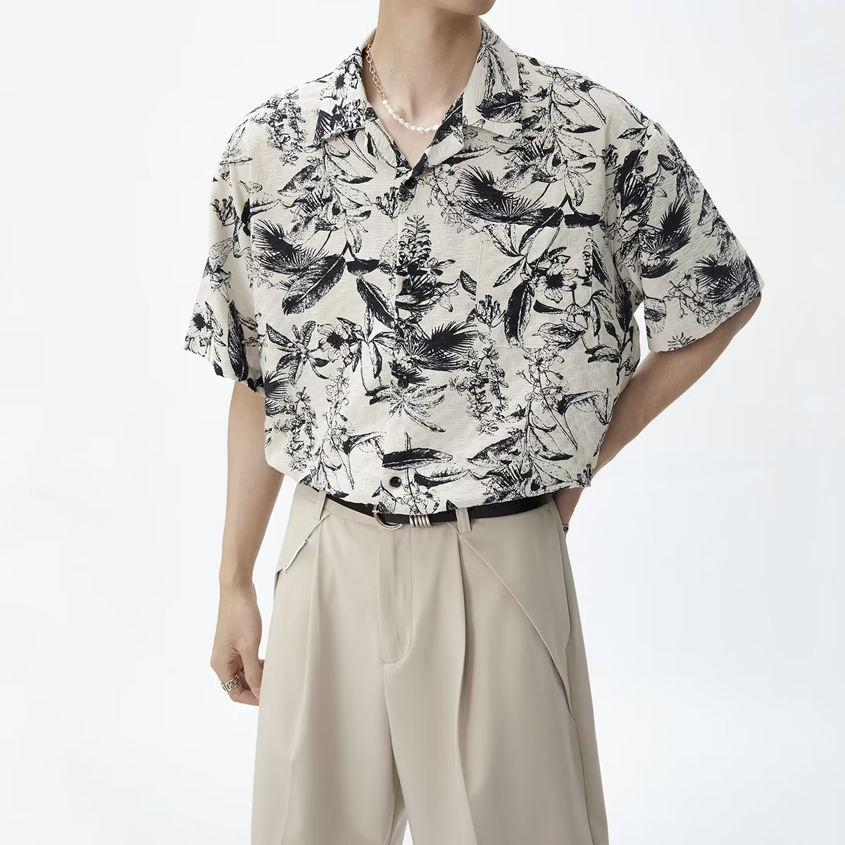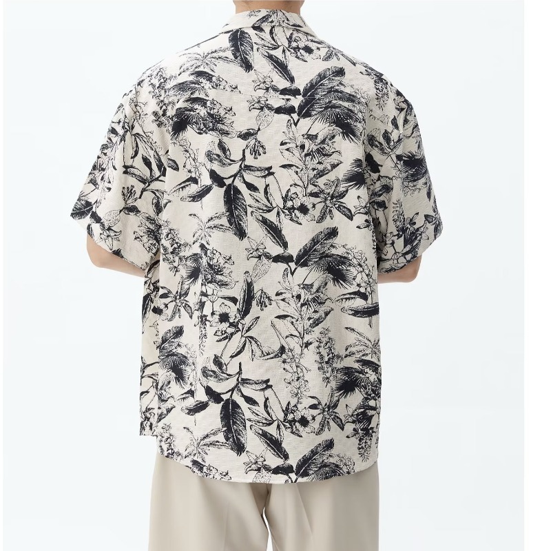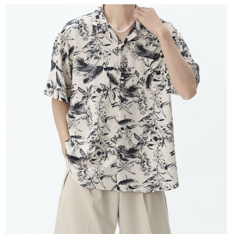 时尚气质水墨印花衬衫男夏季宽松短袖复古港风碎花设计感上衣男装