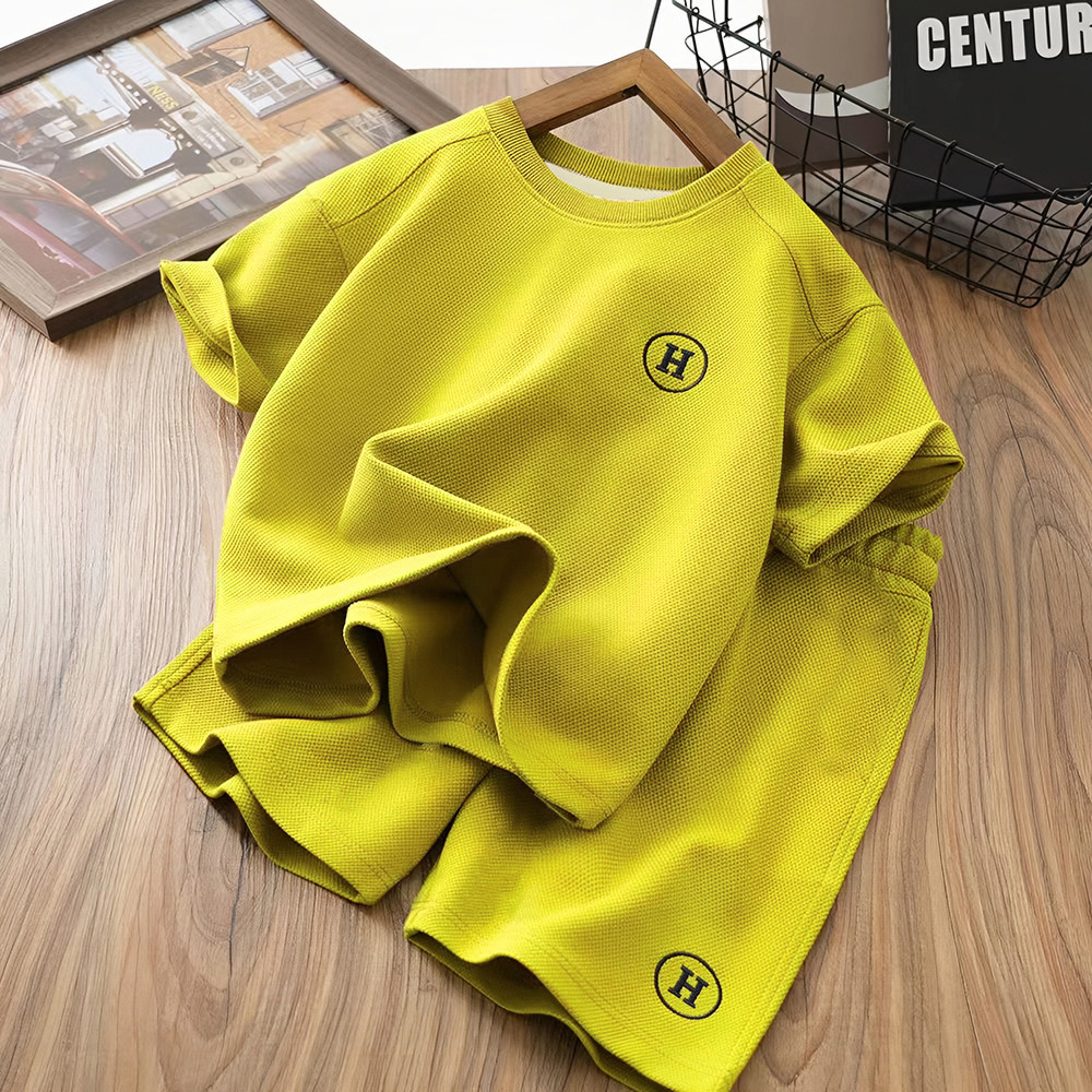 儿童男女夏季短袖套装新款华夫格中大童男孩童装休闲两件套