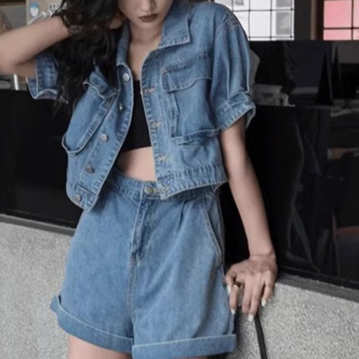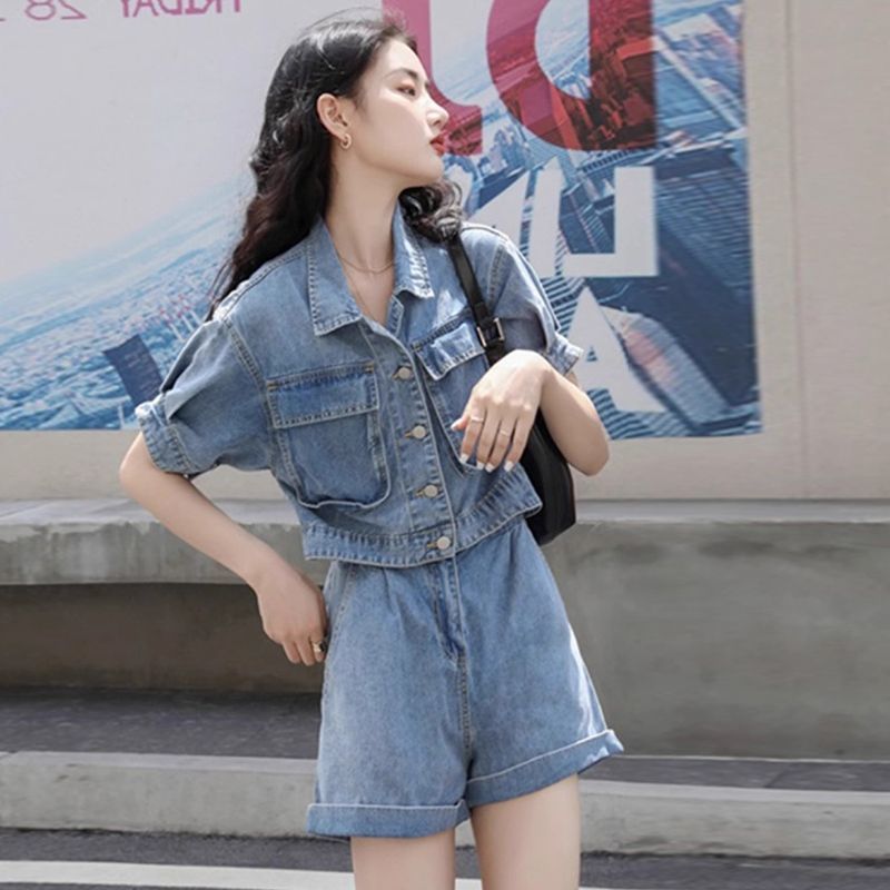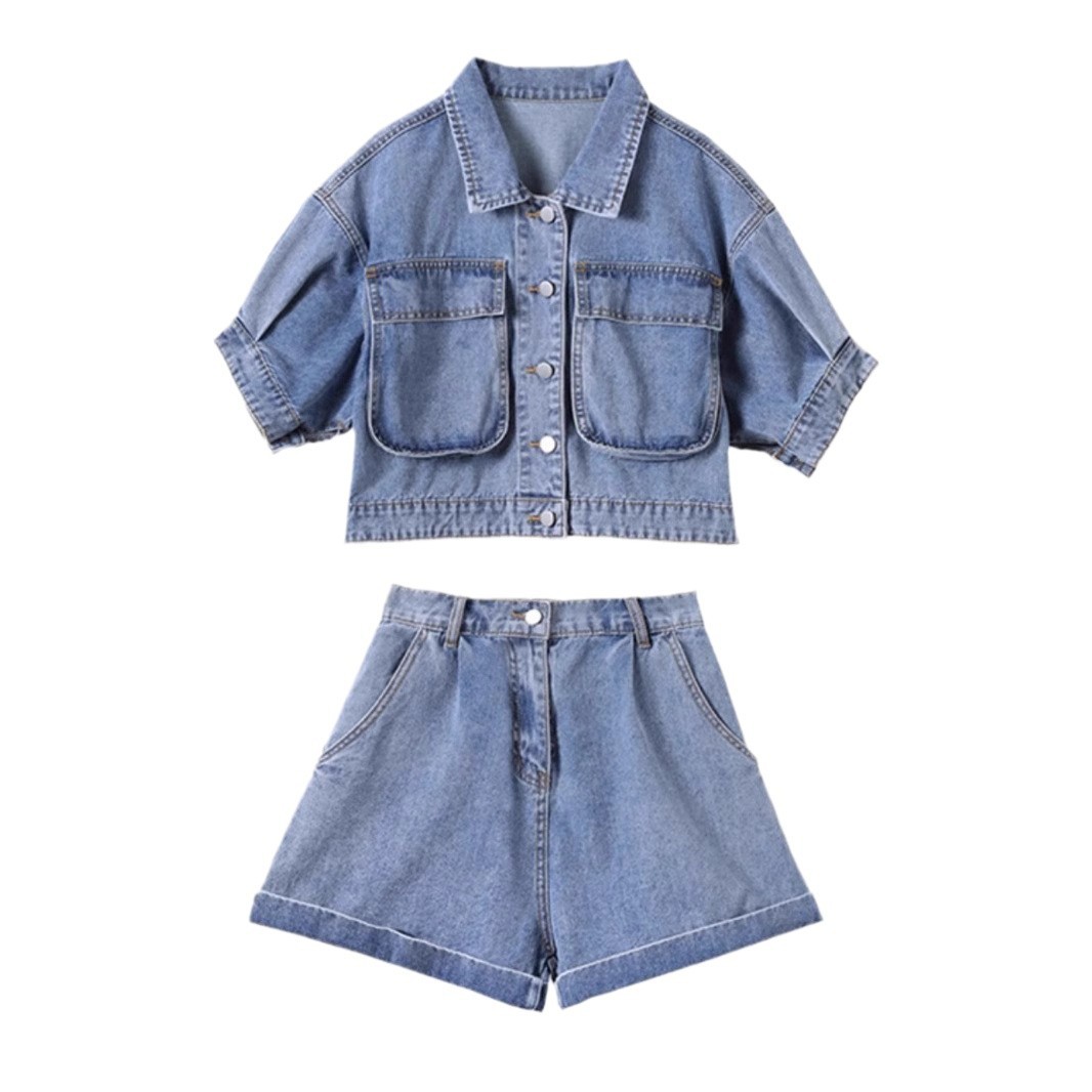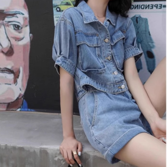 减龄气质设计感牛仔套装女夏季大码胖mm短款衬衫外套短裤子两件套