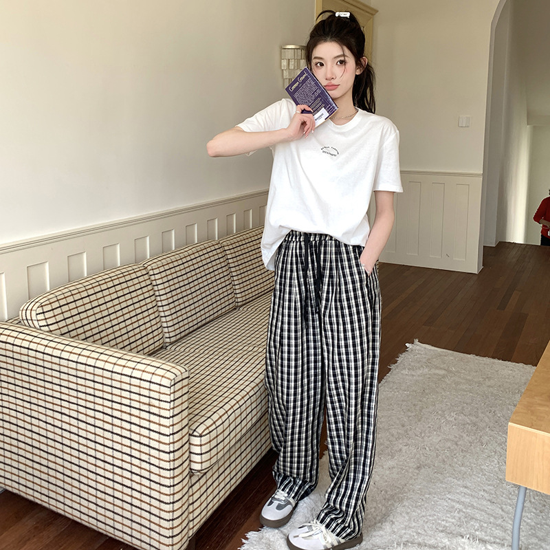 元气少女简约圆领字母印花休闲短款T恤宽松抽绳格子长裤两件套装