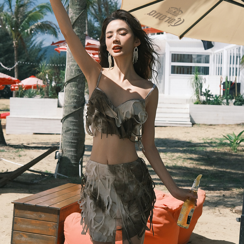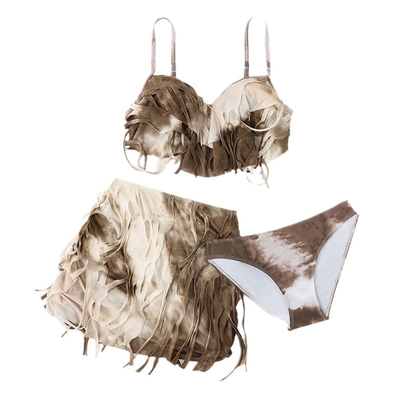 新款美拉德废土风渐变比基尼三件套钢托聚拢显瘦度假泡温泉游泳装