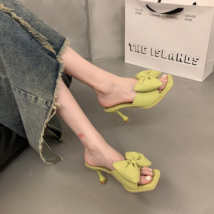 夏季新款蝴蝶结细跟拖鞋女方头露趾高跟鞋时尚气质女鞋