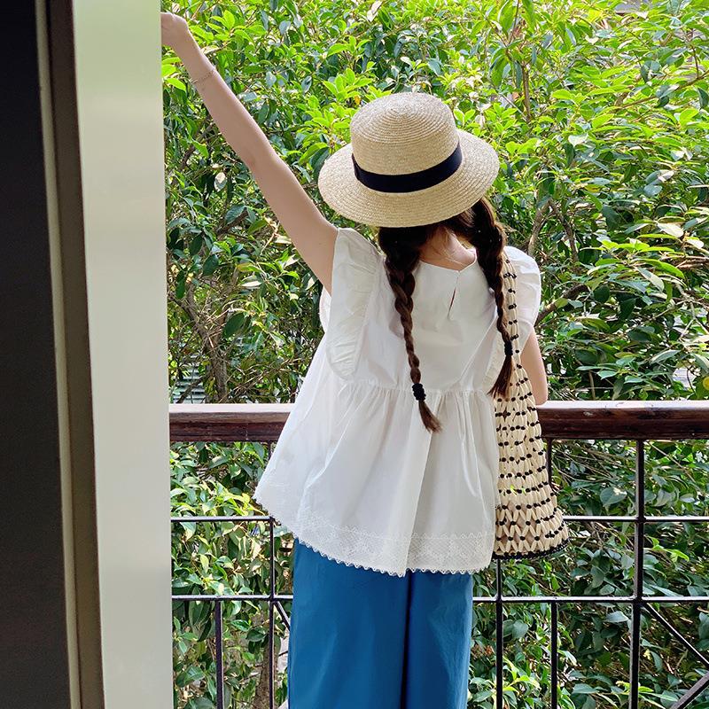 实拍俏皮少女感飞飞袖小圆领蕾丝拼接米白短上衣宽松直筒裤套装女