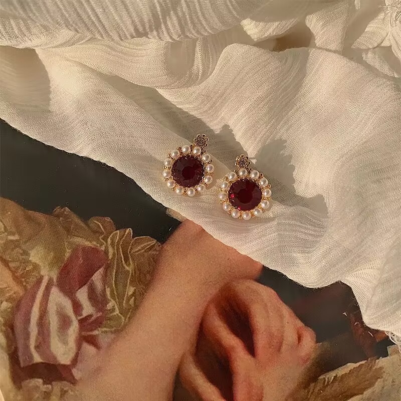 「波尔多红酒」复古宫廷港风耳夹无耳洞显白红珍珠锆石耳钉