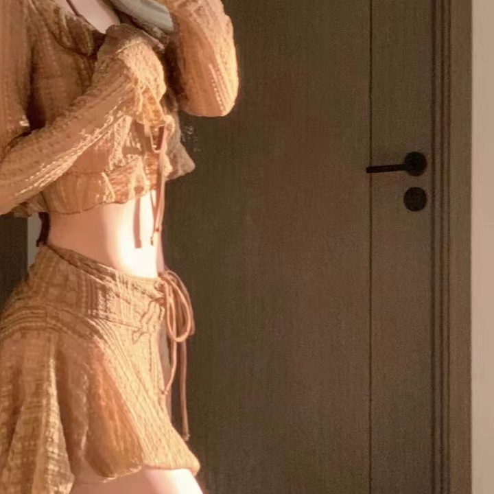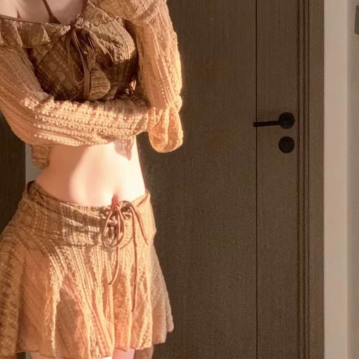 裙式分体泳衣带胸垫四件套女蕾丝性感小胸聚拢保守遮肉防晒比基尼