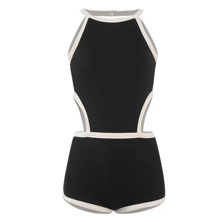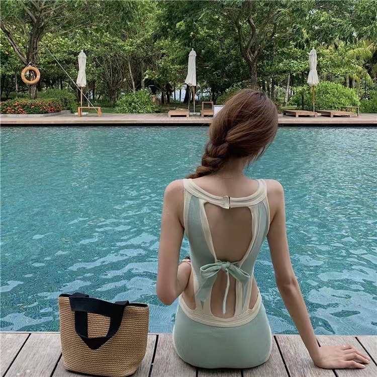 泳衣女韩风露背性感拼色蝴蝶结绑带小胸聚拢遮肚显瘦连体温泉度假