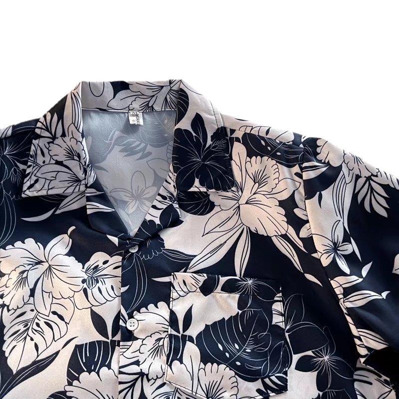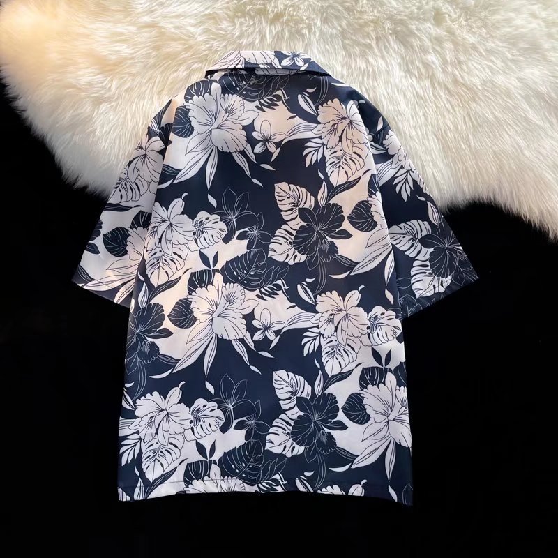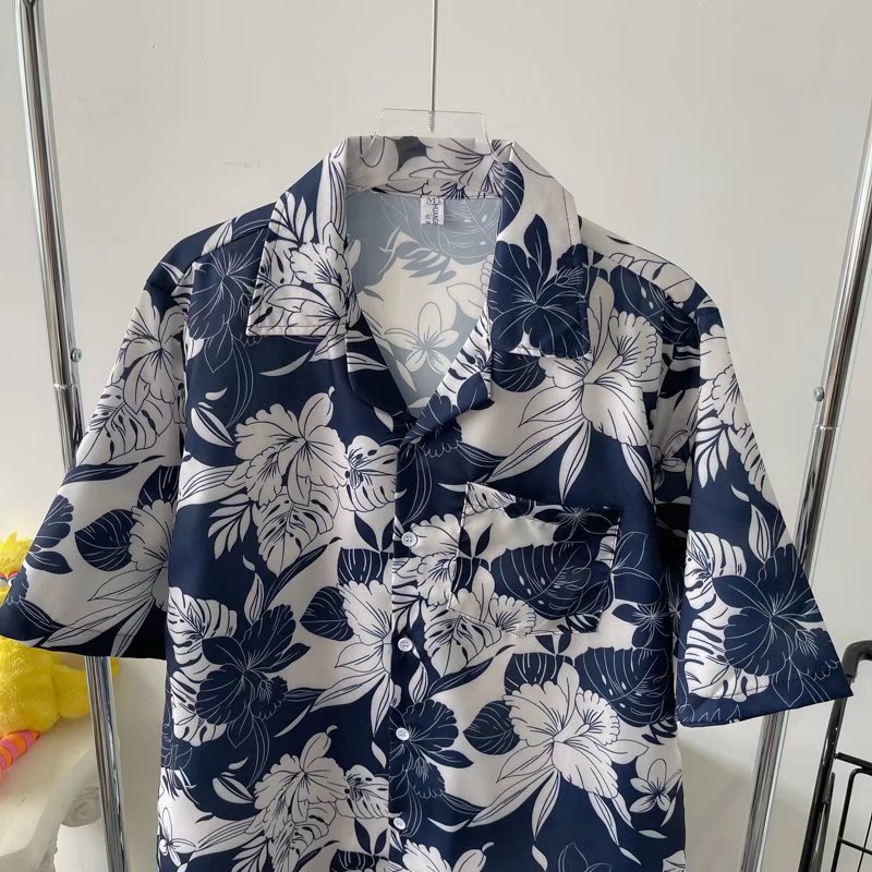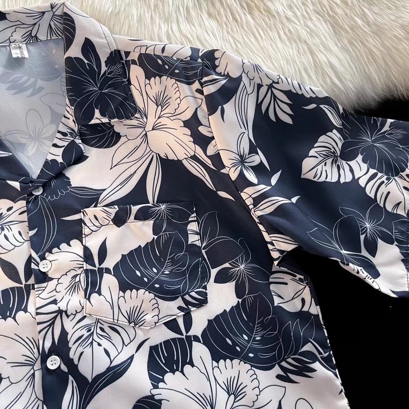 港风vintage油画花卉满印衬衫男女设计感懒惰风宽松情侣短袖衬衣