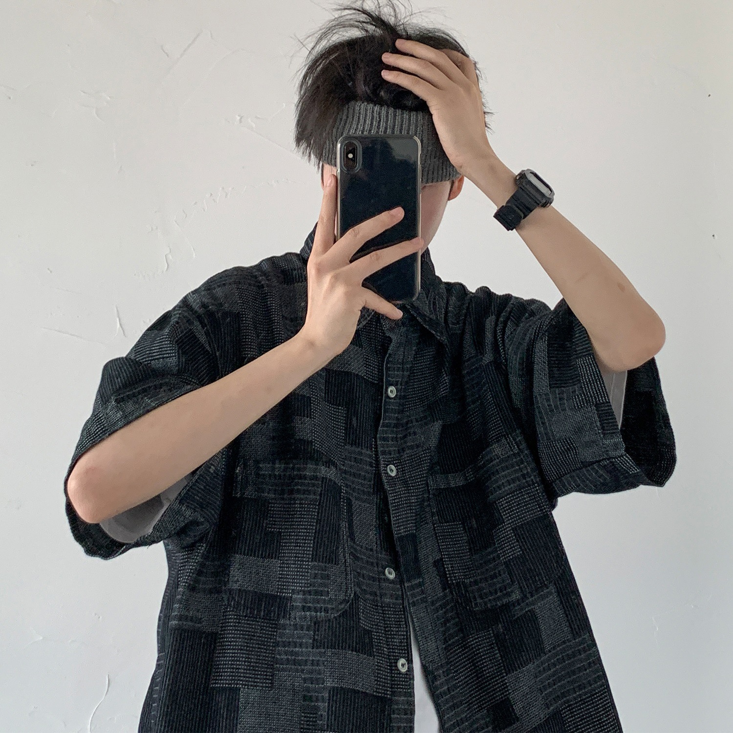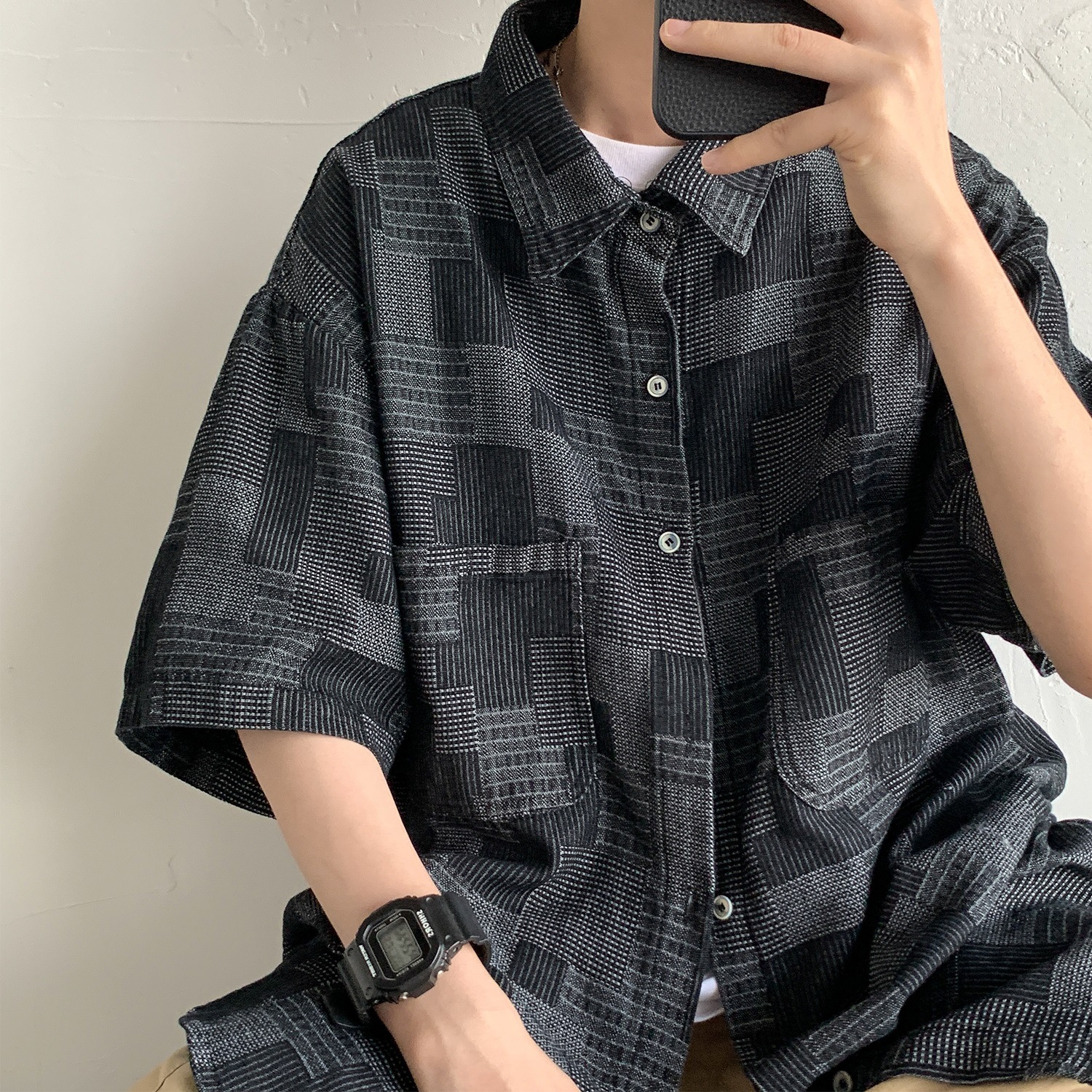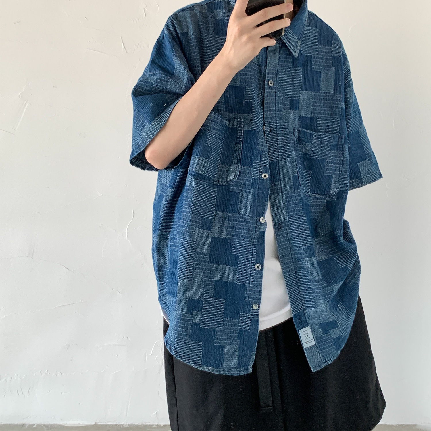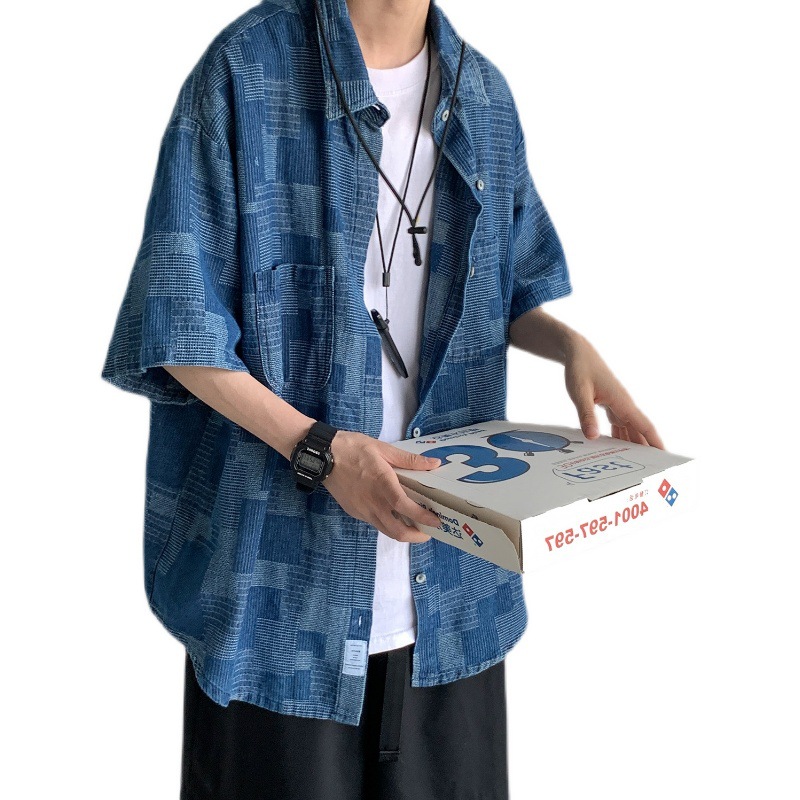 古着感格子牛仔衬衫男设计感小众日系复古pureピュア短袖衬衣夏季
