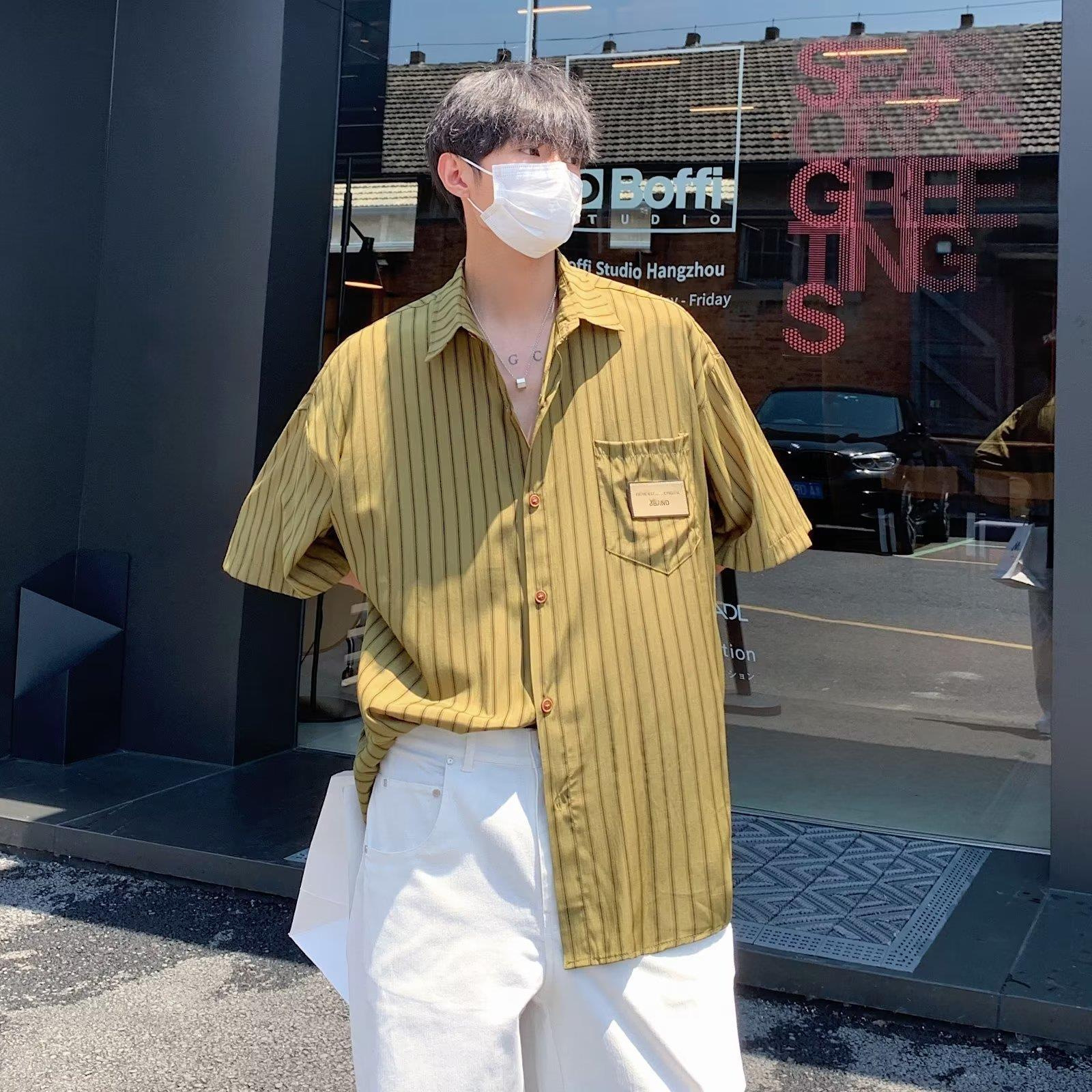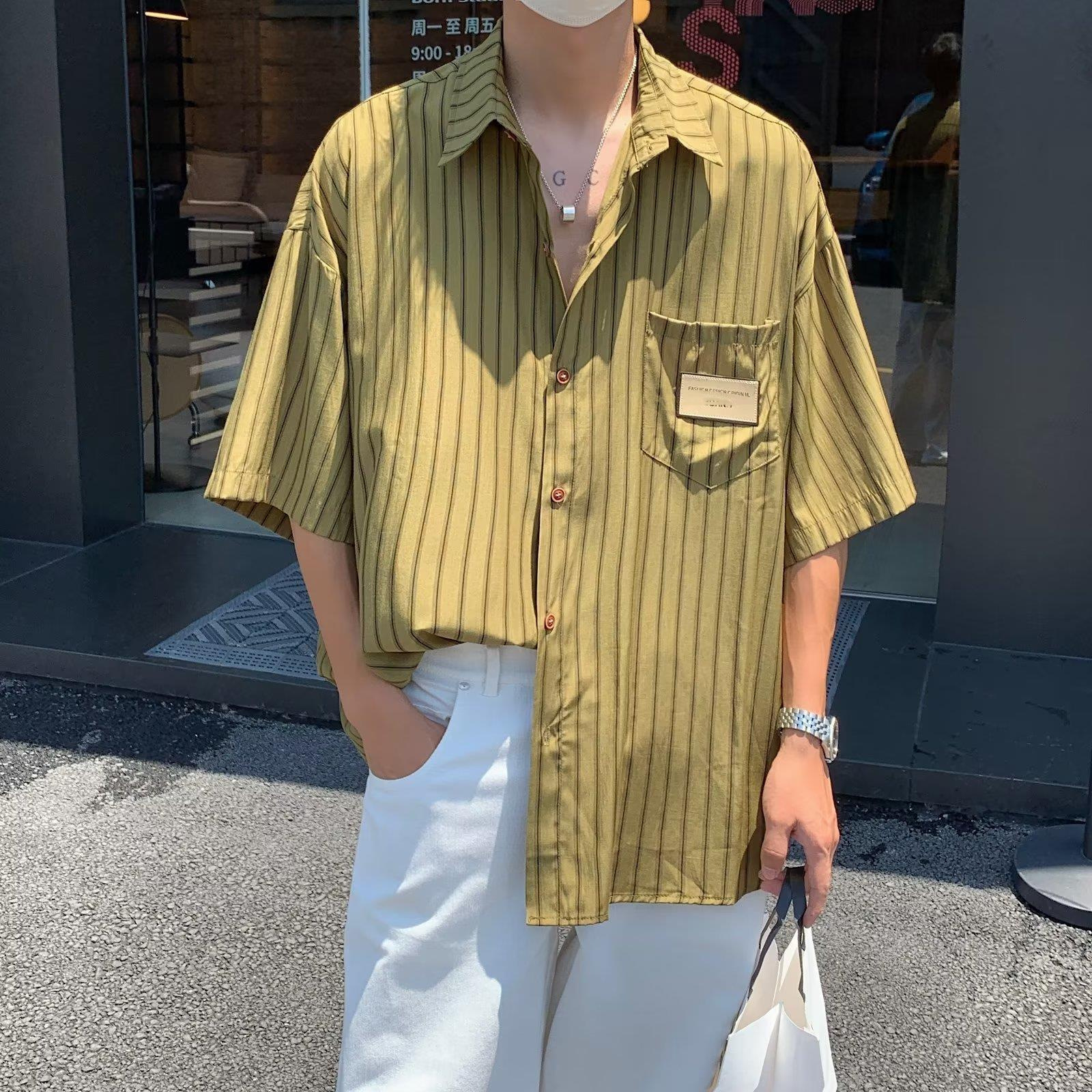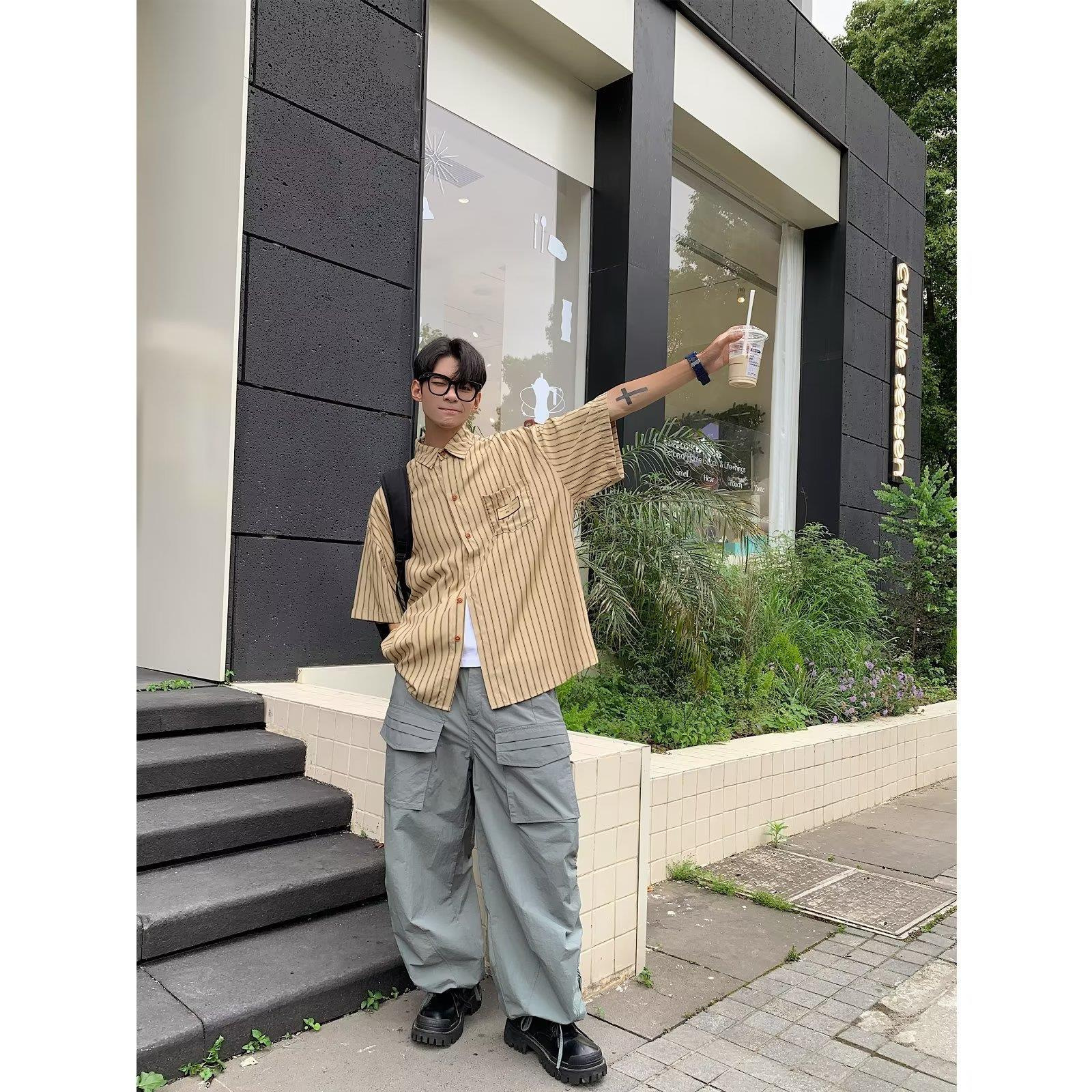 日系条纹衬衫短袖男夏季寸衣设计感上衣外套潮牌潮流痞帅港风衬衣