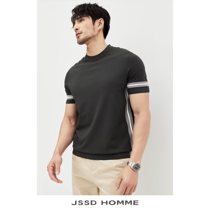 夏季男士冰丝针织T恤薄款圆领修身短袖毛T拼色紧身半袖潮流体桖衫