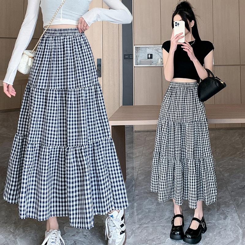 法式层层蛋糕裙复古格子半身裙女新款高腰a字长裙显瘦大摆裙
