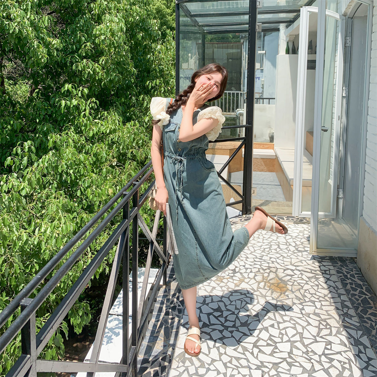 法式V领泡泡袖牛仔连衣裙女夏季新款时尚高腰显瘦气质衬衫裙