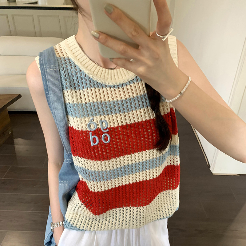 港风复古多巴胺宽松镂空彩条纹无袖针织背心女夏新款外穿韩系上衣