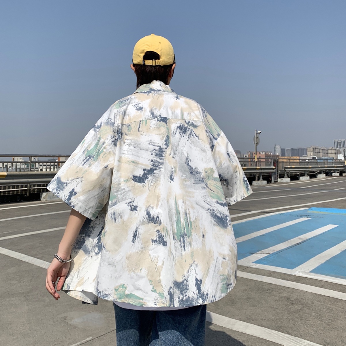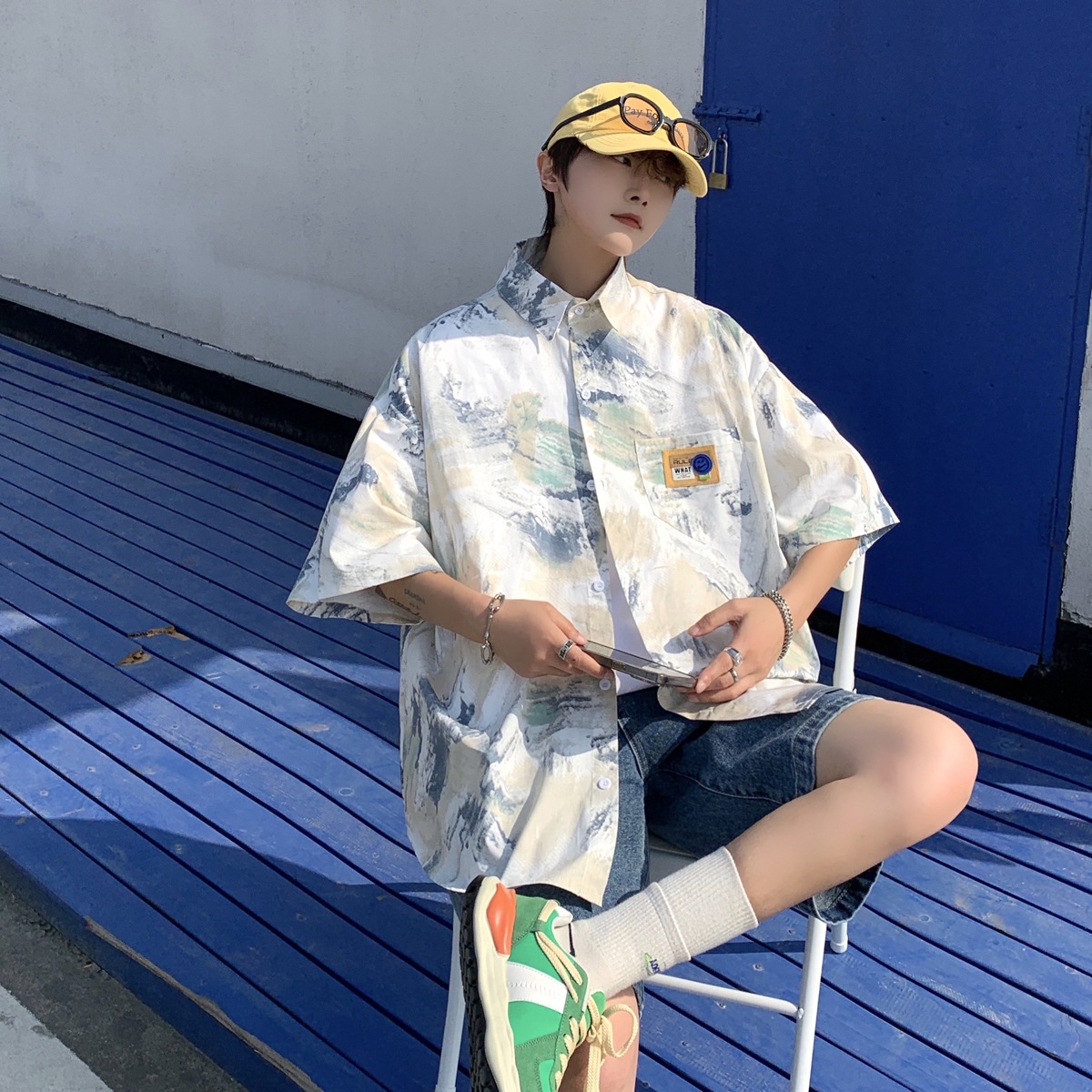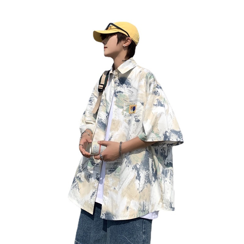 原宿风衬衫夏季新款设计感情侣口袋油画短袖日系港风ins衬衣开衫