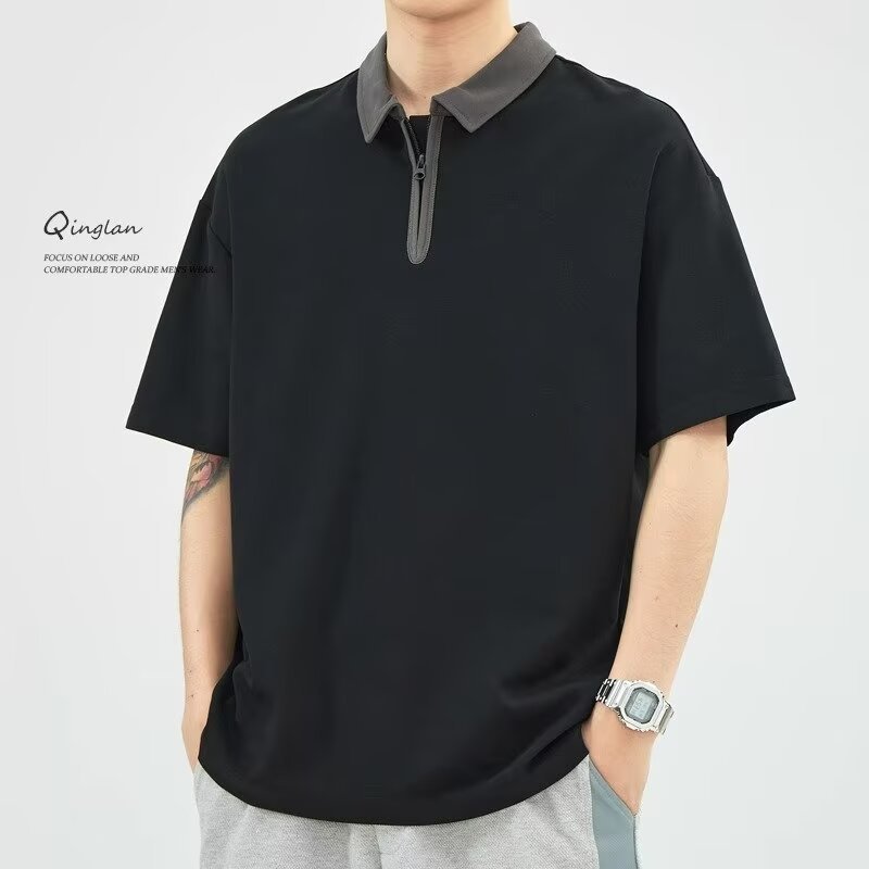 夏季短袖polo衫男潮牌宽松简约休闲百搭翻领半拉链设计感t恤黑色