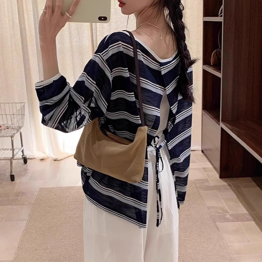小个子藏蓝色条纹长袖t恤女防晒罩衫薄纱宽松露后背镂空上衣夏季