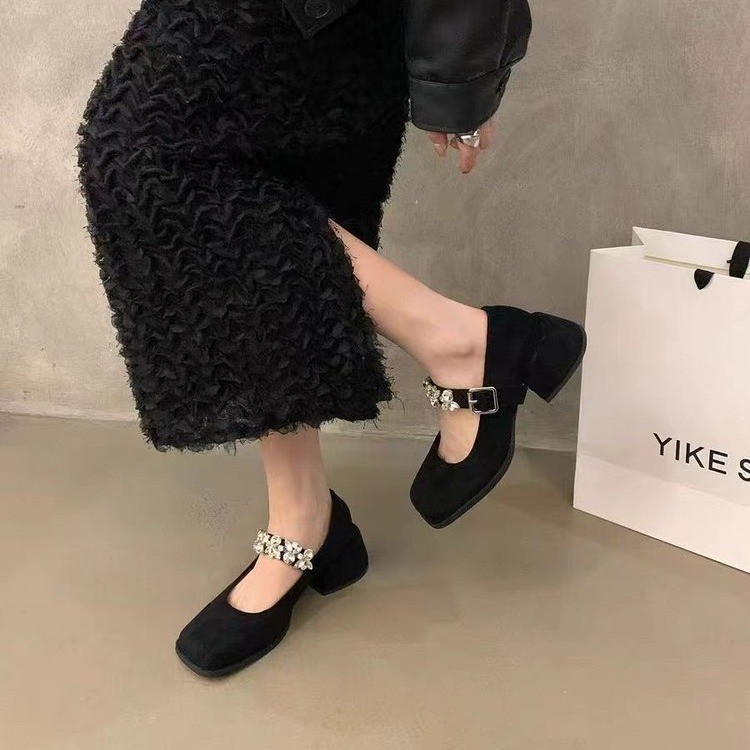 黑色方头单鞋女2025春季新款一字扣带气质高跟鞋粗跟玛丽珍小皮鞋