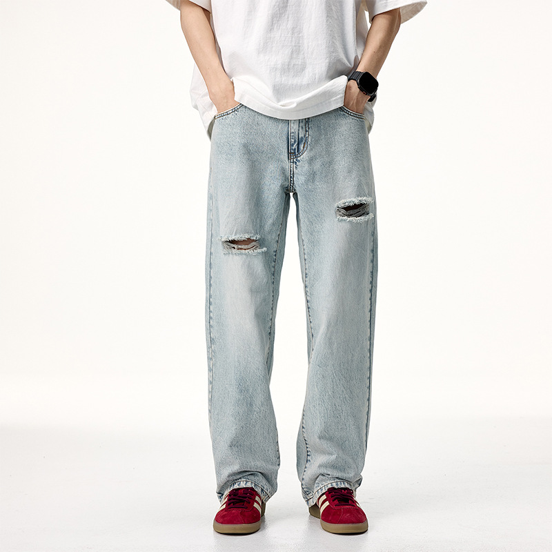 美式复古石青色破洞牛仔裤男春季潮牌宽松直筒男士磨白水洗休闲裤
