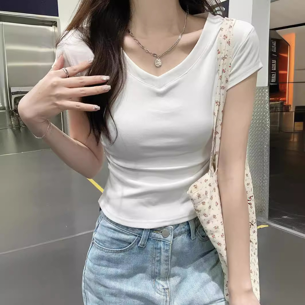 小个子圆领正肩休闲短袖T恤女夏修身显瘦短款辣妹设计感小众上衣