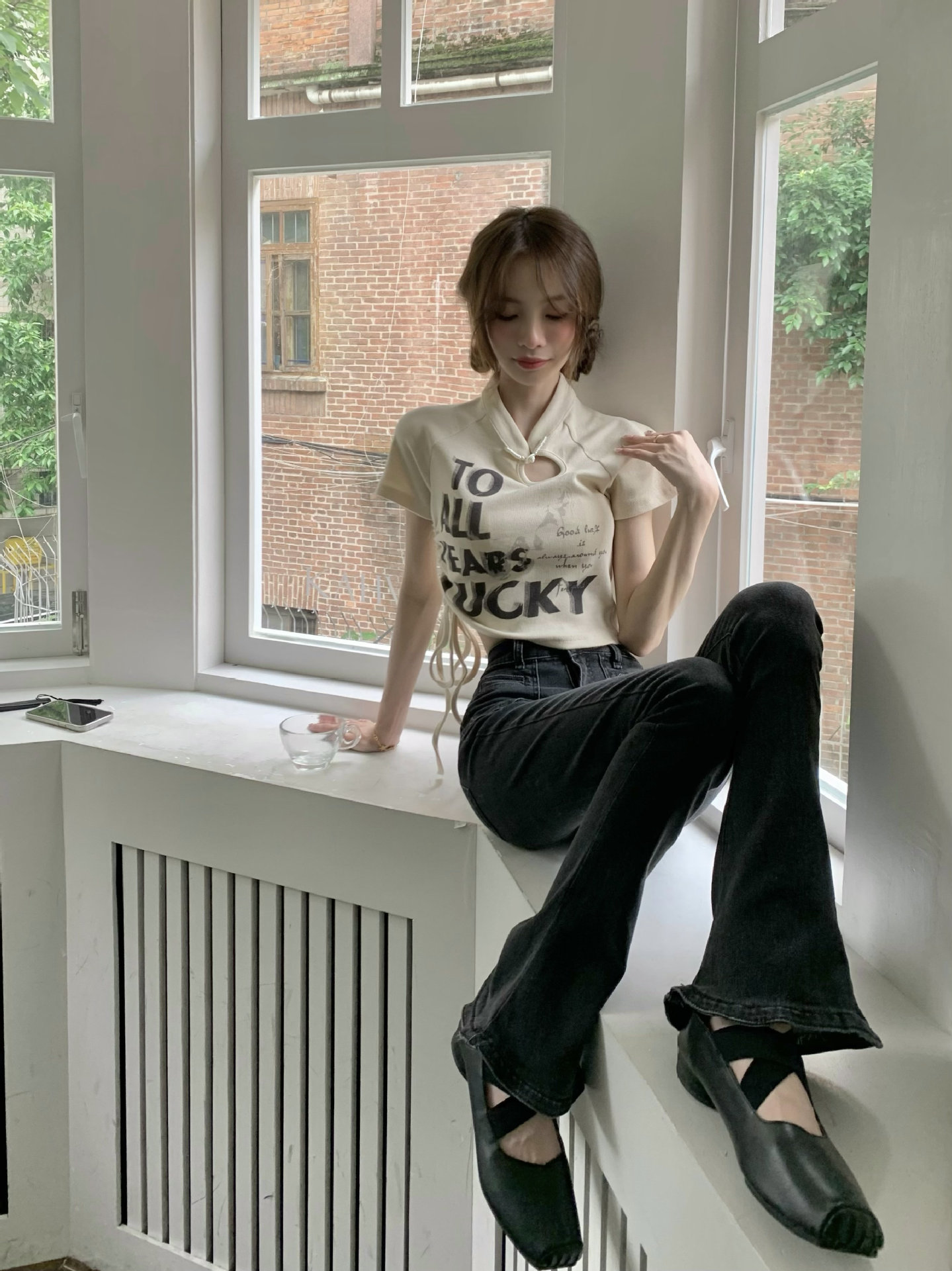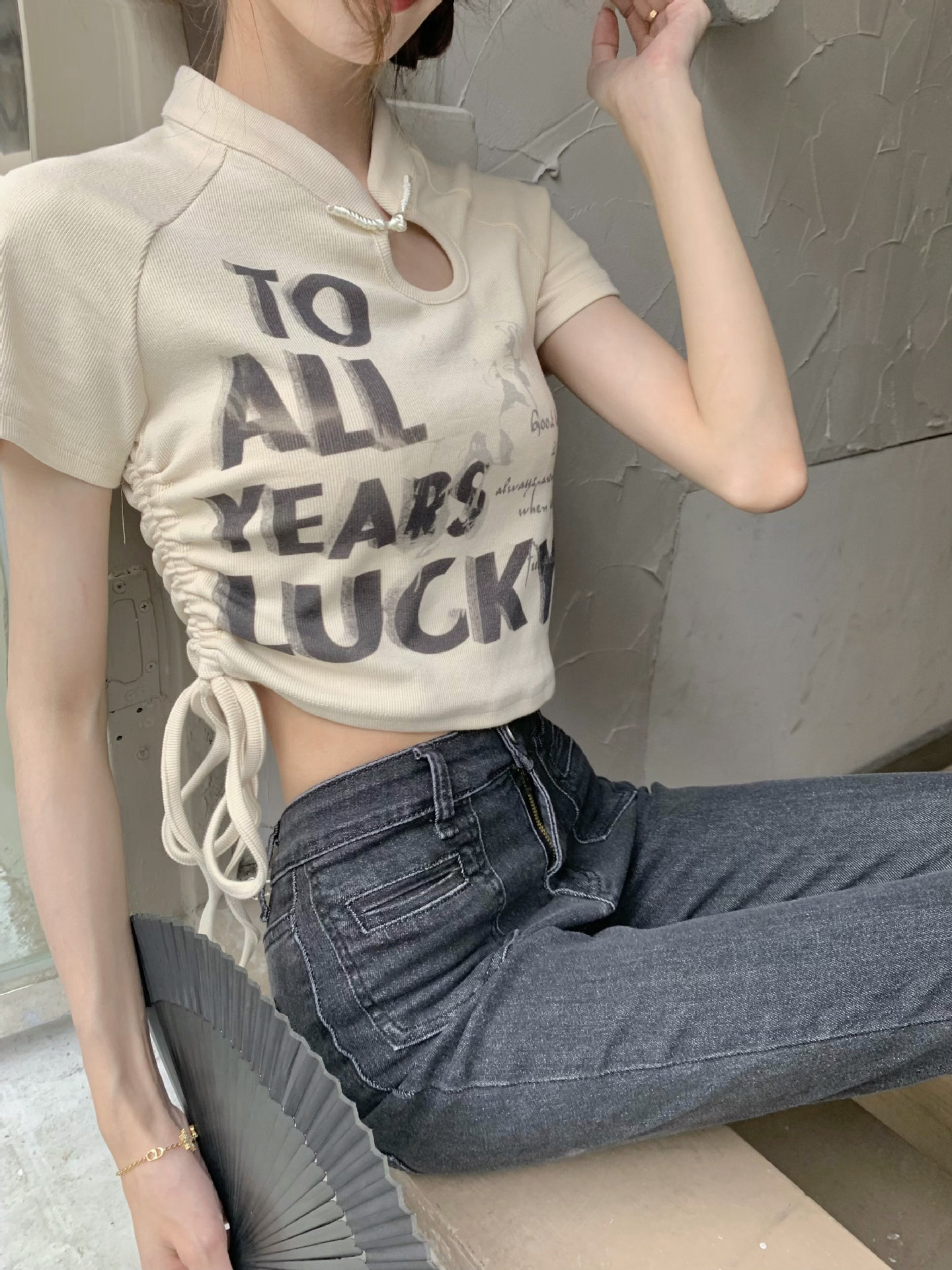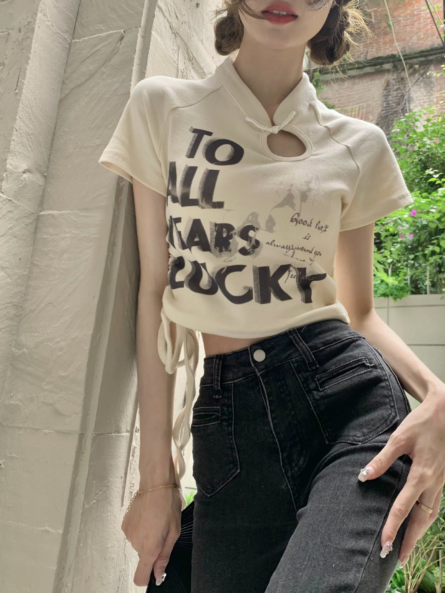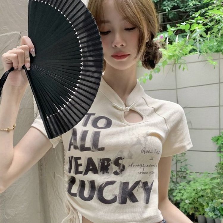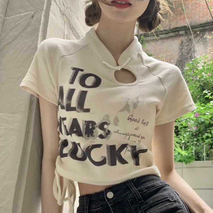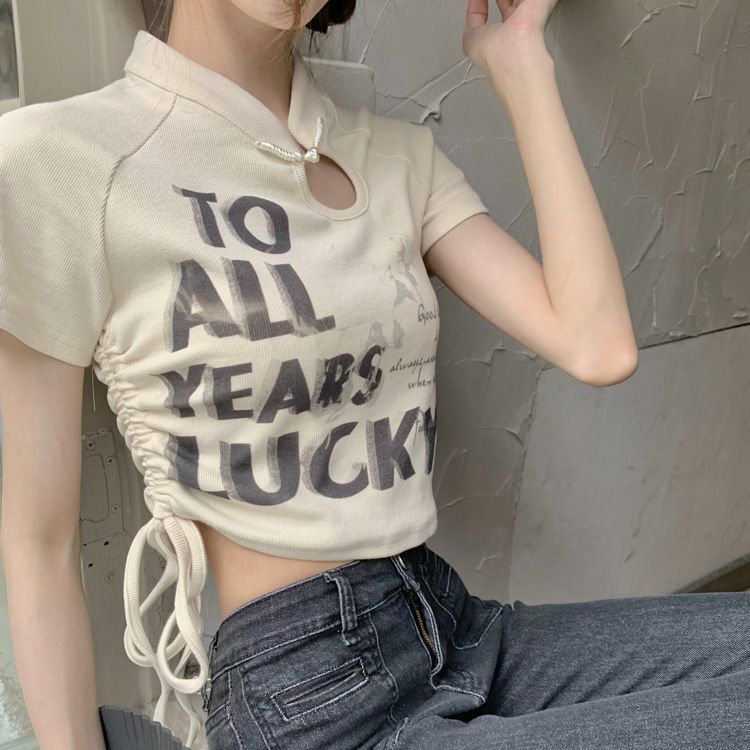 冰丝螺纹国潮复古甜酷辣妹印花抽绳设计短款T恤女学生镂空修身