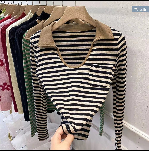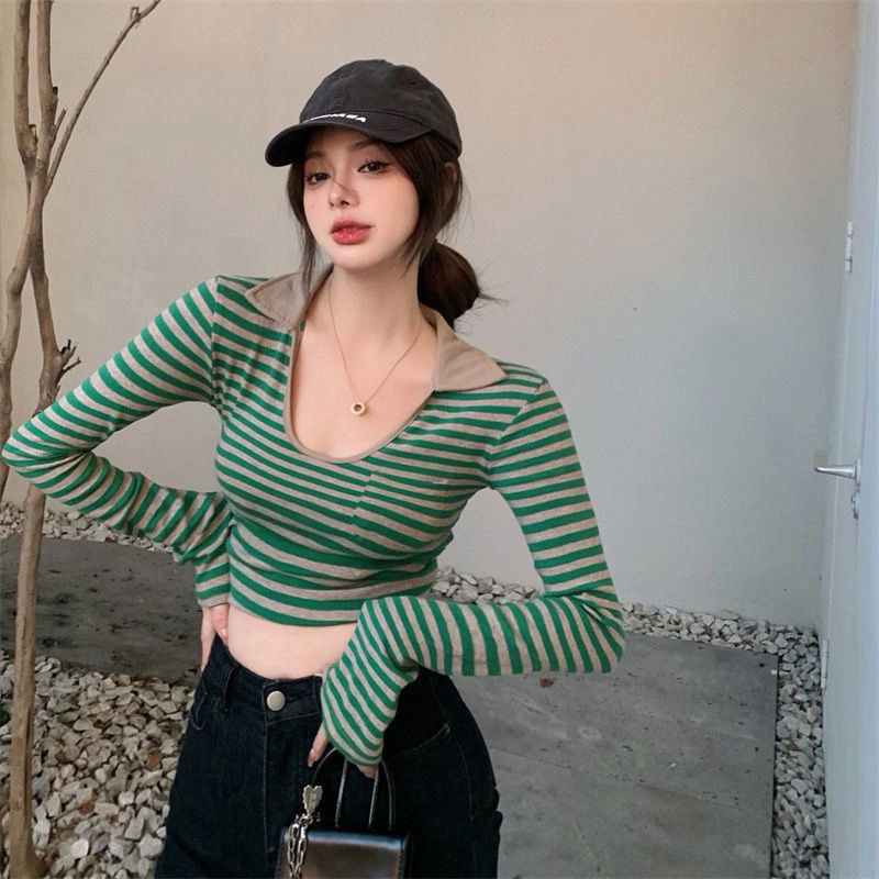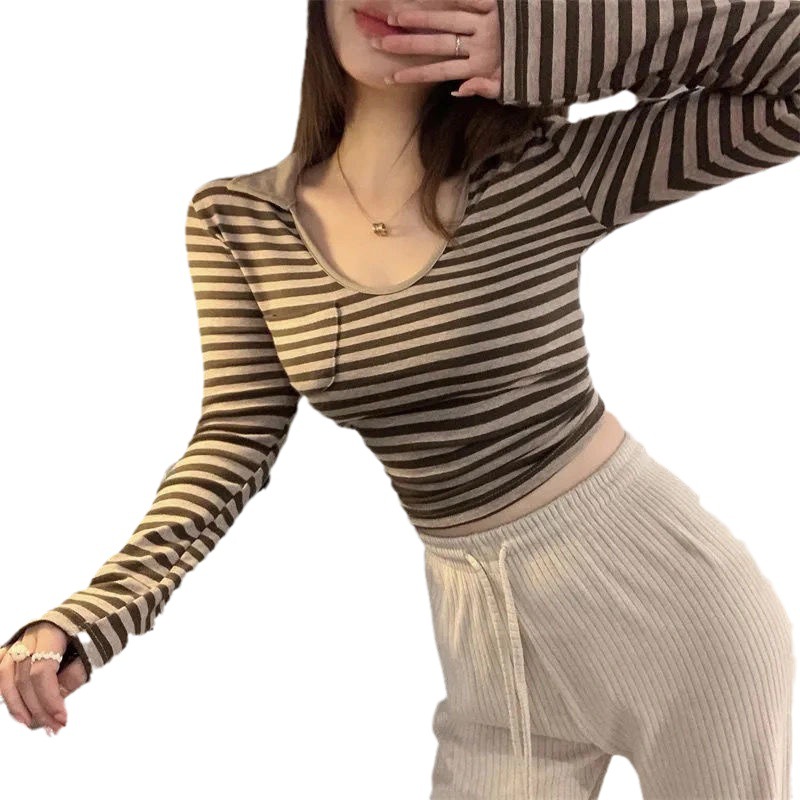 纯棉色织条U领条纹修身显瘦短款辣妹风显瘦长袖t恤女新款欧货上衣
