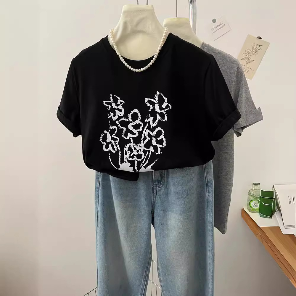 夏季新款十三行女装小花印花简约百搭圆领正肩莫代尔短袖T恤
