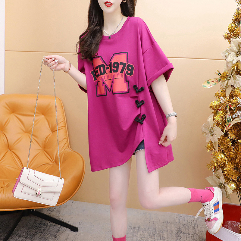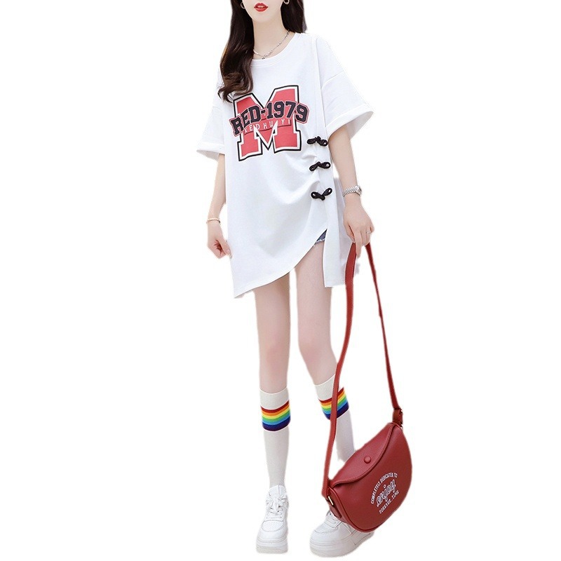 纯棉时尚洋气中长款分叉短袖大t恤女夏季新款宽松设计感上衣